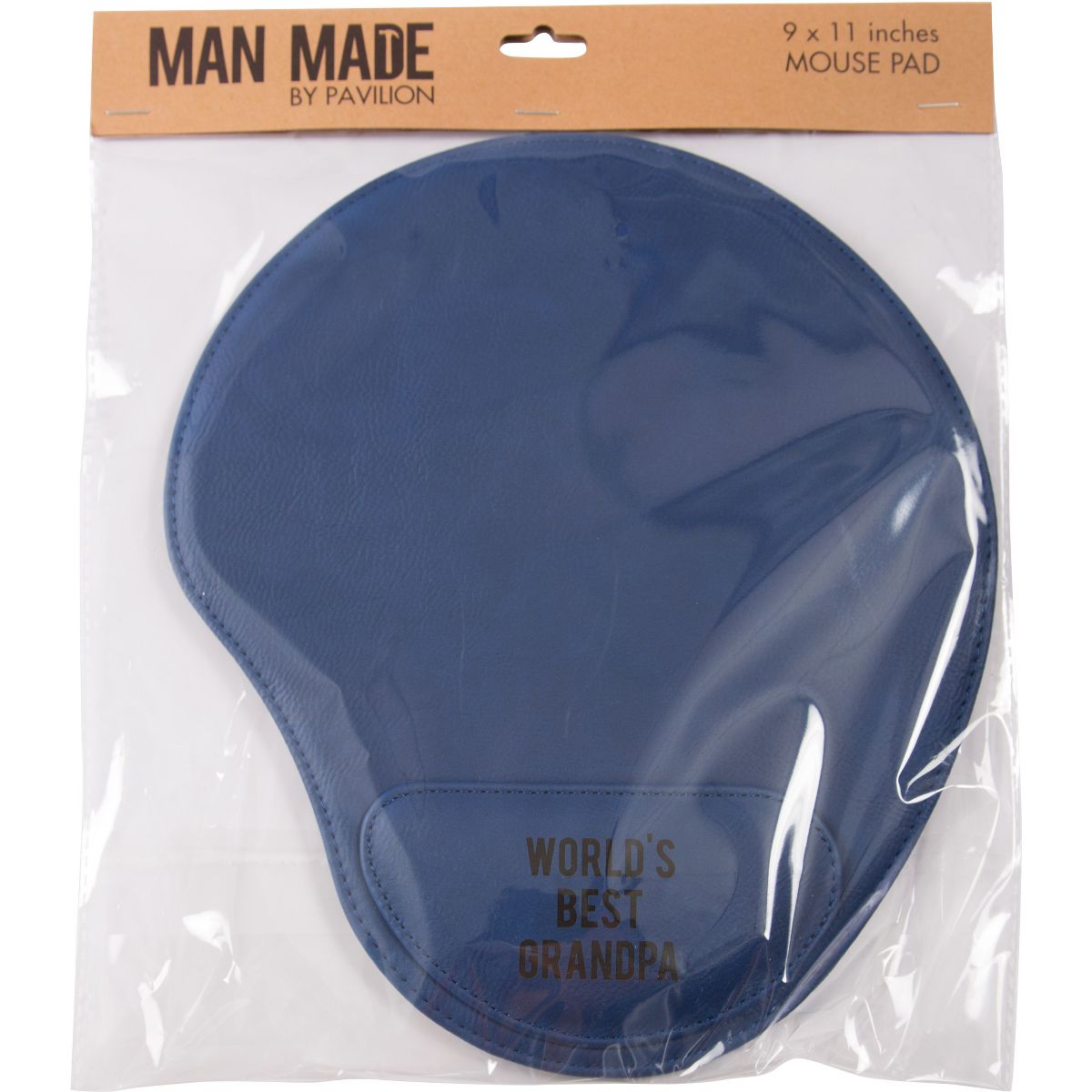 Mousepad with cushioned section, packaged in a plastic polybag, is made from vegan leather. "World's Best Grandpa" text is laser-printed onto the cushioned section of the mousepad. Wipe clean with a damp cloth, if necessary. Great for gifting to a grandpa who loves to use the computer.