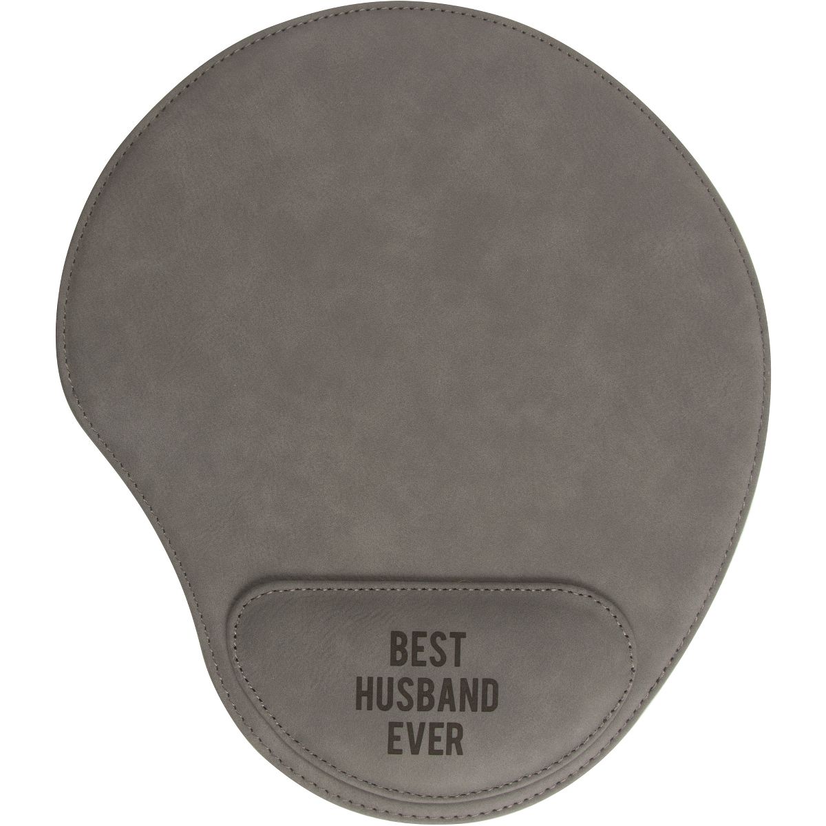 Mousepad with cushioned section, packaged in a plastic polybag, is made from vegan leather. "Best Husband Ever" text is laser-printed onto the cushioned section of the mousepad. Wipe clean with a damp cloth, if necessary. Great for gifting to a husband who loves to use the computer.