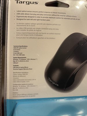 The Targus USB Optical Laptop Mouse is a three-button mouse with an ergonomic design to provide comfort while in use. Designed for both left and right-handed users, the mouse features an integrated scroll wheel making it easy to navigate through web pages or lengthy spreadsheets at a quick pace. Featuring a 6' USB connection and a 1,000 DPI optical sensor, this cost effective mouse is easy to use - simply plug and play. No drivers are required. Large enough for comfortable desktop use, this mouse is also small enough to fit inside of a laptop case for easy travel.