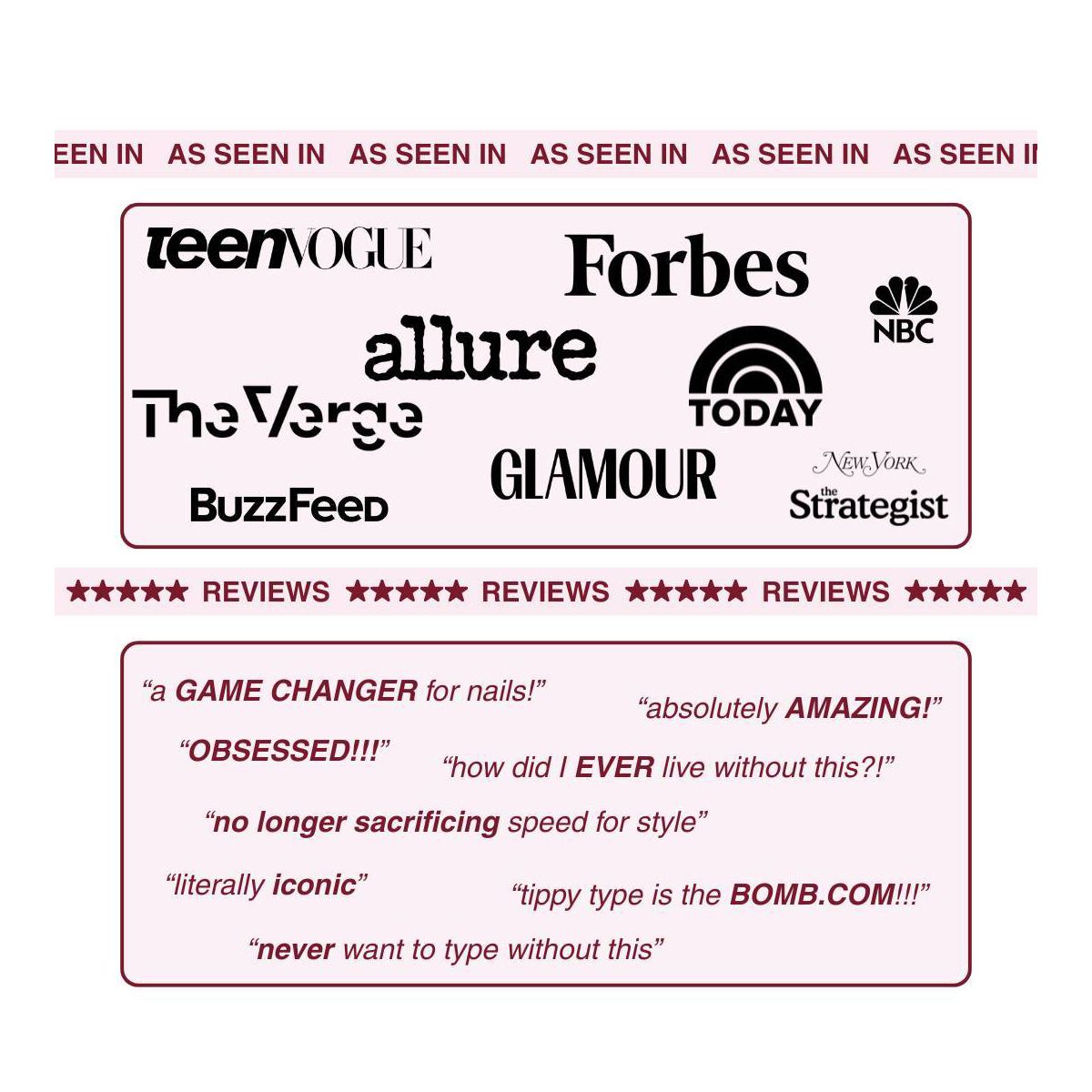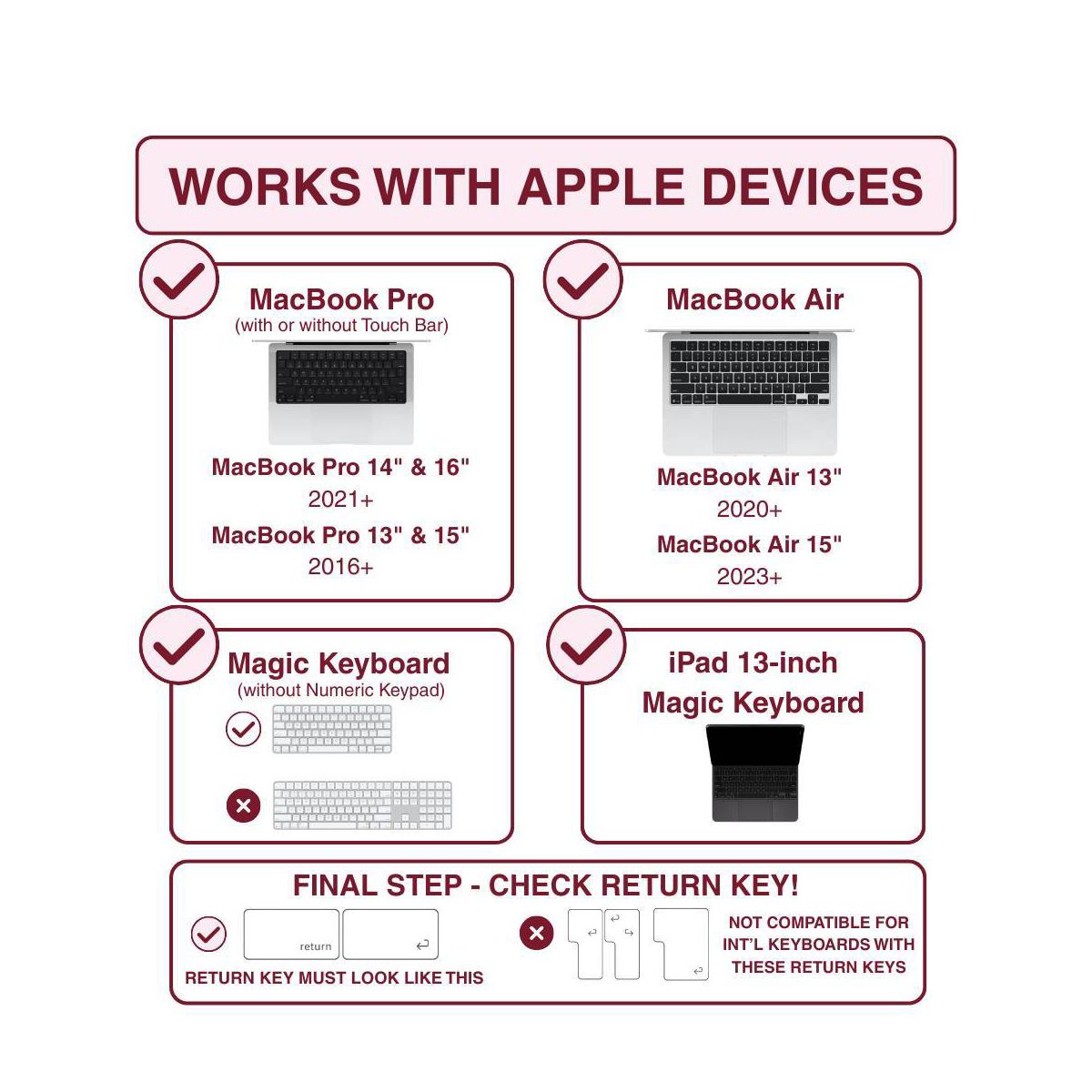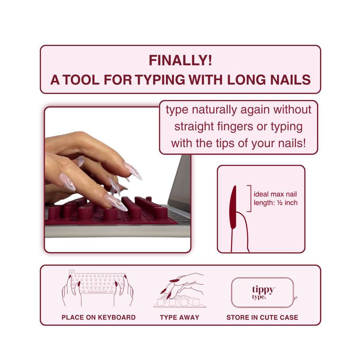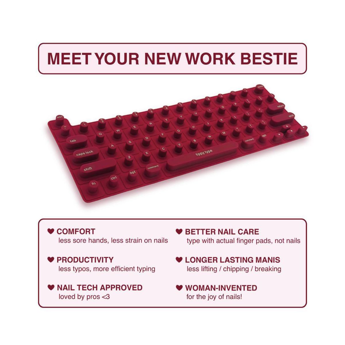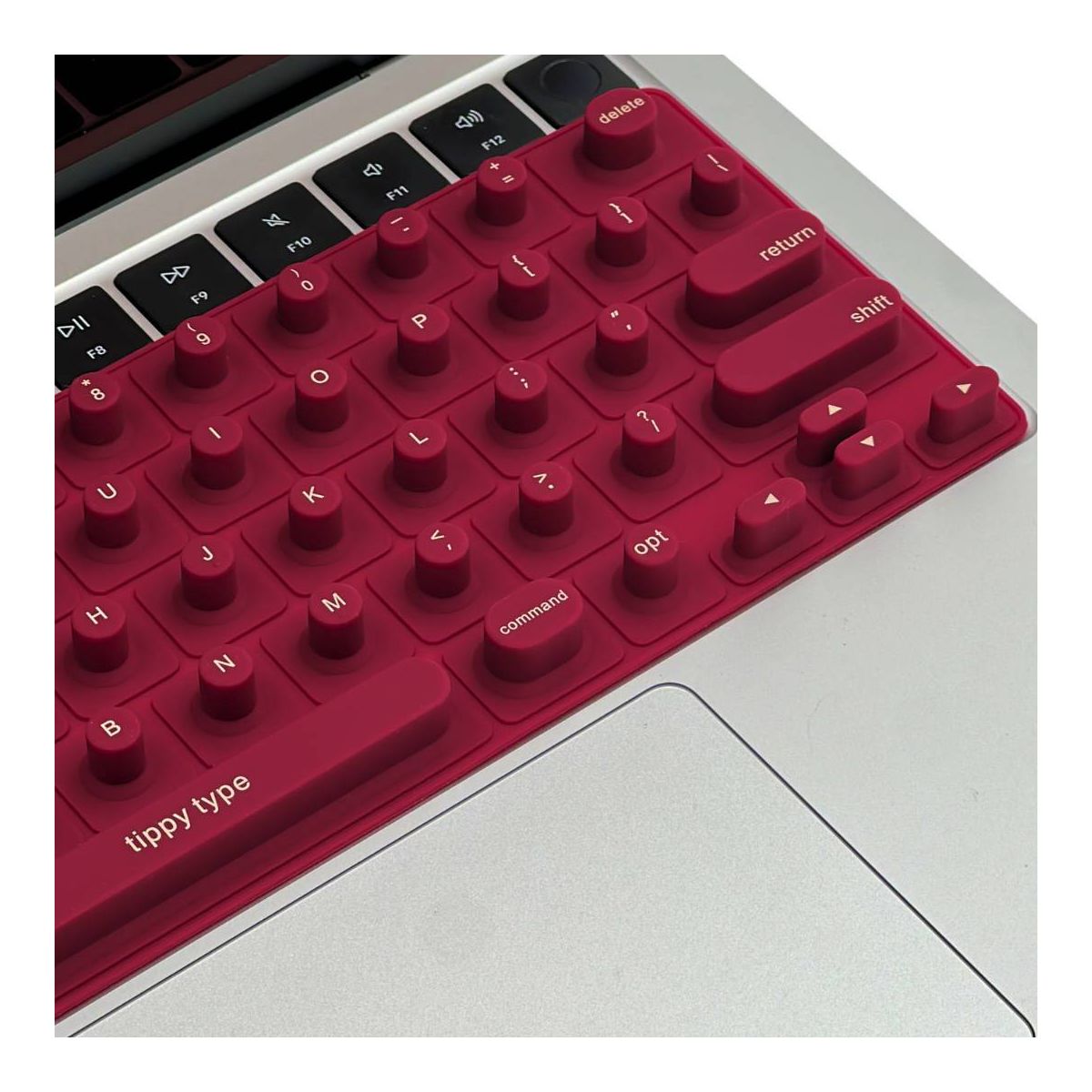 Struggling to type with long nails? tippy type is a woman-invented, patent pending, first-of-its-kind manicure-friendly keyboard cover designed just for you. Made from high-quality, velvety-soft silicone, tippy type features raised keys that support natural hand positioning, reduce finger soreness, and help you type comfortably and quietly—no more annoying "clack-clack" sounds. By allowing you to use your actual fingertips instead of your nail tips, it helps extend the life of your manicure and minimize damage to your nailbeds. Nail tech-approved and built for productivity, tippy type improves accuracy and reduces typos so you can type faster, work smarter, and keep your stylish nails looking flawless. tippy type is compatible with Apple devices (USA Versions only): MacBook Pro (14" & 16" [2021+], 13" & 15" [2016+]), MacBook Air (13" [2020+], 15" [2023+]), Magic Keyboard (without Numeric Pad), iPad 13-inch Magic Keyboard.