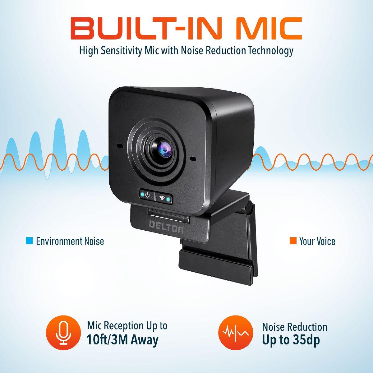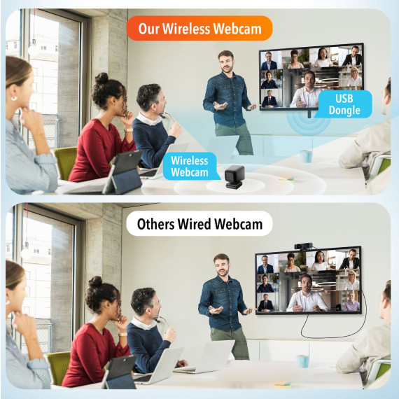 Experience professional-grade video calls and recordings with Delton's usb webcam with microphone, featuring an HD lens and Full HD 1080p video, ensuring crystal-clear visuals. The Built-In Microphone offers pristine audio clarity from up to 10 feet away, complemented by the convenient Power Button for effortless on/off control. Our office webcam is equipped with a pairing button for seamless connectivity and a Universal Mount Clip for versatile placement. Featuring a 2.4 GHz connectivity, ensuring a stable connection up to 65ft indoors and 150ft outdoors. The conference webcam is equipped with Auto White Balance (AWB) and Auto Focus functionalities for effortless adjustment to lighting conditions and ensuring sharp, clear visuals.