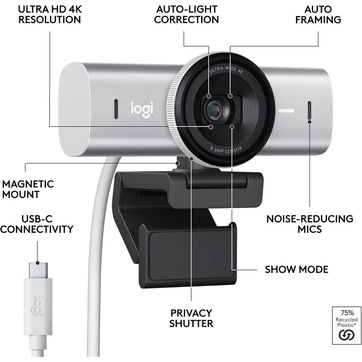 Meet, stream, master with MX Brio's sharp ultra HD 4k resolution video. With 2x better face visibility and 2x finer image details in difficult light, AI enhancements, a Logi-designed lens, 70% bigger pixels and our largest webcam sensor yet. Use Fine Controls to adjust lighting, white balance with ISO, Shutter Speed, Temperature, Tint and Vibrance. Be heard clearly with dual omni-directional mics with noise-reducing technology that suppresses background sound. Share your physical work and notes on video calls by tilting the camera down in Show Mode.