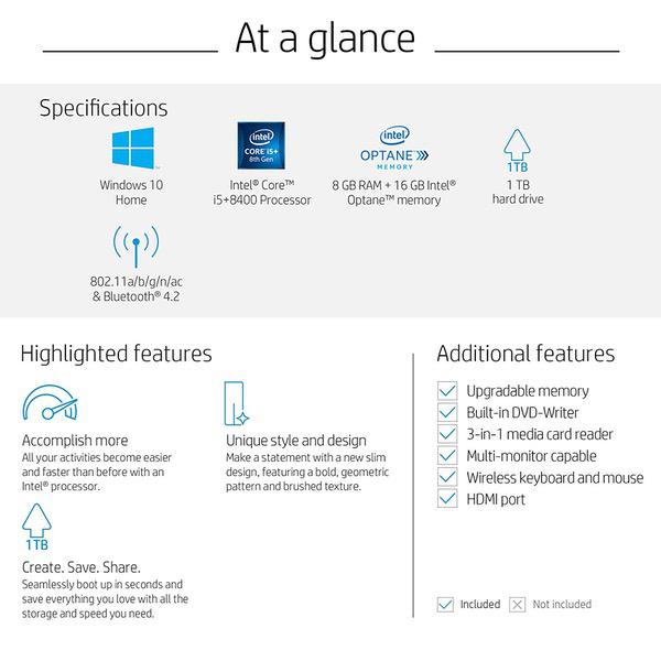 Make sure this fits by entering your model number. ACHIEVE MORE - For the hardworking multi-tasker, the HP Pavilion Desktop empowers you to simultaneously work on multiple projects and easily create with exceptional storage and innovative speed FAST PROCESSOR - 6 core 8th Generation Intel Core i5+ 8400 processor and Core i5, equipped with Windows 10 Home Intel Optane MEMORY 16GB - Optane memory accelerates new processor-based systems to deliver a responsive computer experience with short boot times, fast application launches, extraordinary gaming, and responsive browsing GREAT FOR MULTI-TASKING - 8 GB DDR4-2666 SDRAM memory works with Intel Optane memory to help you run multiple programs at once ALL THE TOOLS YOU NEED - McAfee LiveSafe 30-day trial and 25 GB of Dropbox space free for 12 months with your HP device when you sign up your device, 1TB 7200RPM SATA hard drive SMOOTH ENTERTAINMENT -  Intel UHD Graphics 630 to smoothly stream your favorite shows and games EXTENSIVE PORT CONNECTION - Headphone and microphone Combo, 5.1 surround sound output, 2 USB 3.1, 1 USB 3.1 Type-C,  4 USB 2.0, 2 USB 3.1, 1 HDMI plug in, built-in DVD-Writer, and 3x faster wireless bluetooth transmitter with WLAN & Bluetooth 4.2