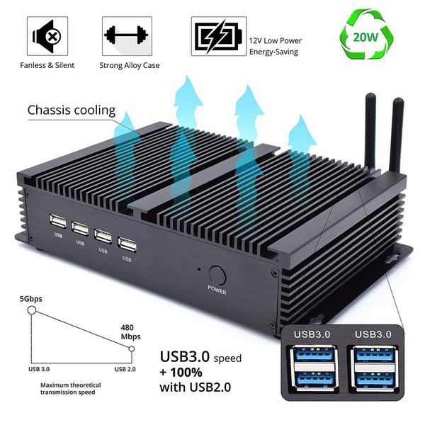 I got the model with 8 GB of RAM, a 128 GB SSD, and a Dual Core i5 CPU. It has a 1.8 GHz clock speed (instead of the 1.7 GHz advertised - BONUS!), with a maximum turbo boost of 2.6 GHz. THE GOOD: There is so much to like about this little guy, its hard to know where to start. I guess Ill start with the speed, its got some pep to it. I have other tiny PCs that are... OK. In the interest of making them cheap and low power, they have a Celeron or Atom CPU, 4 GB of RAM, and 64 GB SSDs in them. For the uses I put them to, they are fine, but they are slow to start up and they feel like 15-year old machines when setting them up - quite sluggish by todays standards. Not so with this thing! Out of the box, its boot time (pressing the power button to ready to use) was under 19 seconds. Office applications (word processing, spreadsheets, etc.) run fast, web browsing and media playback are smooth. The next thing I like is the passive cooling. This is, as advertised, a fanless computer. In fact, the factory configuration has no moving parts at all, so its dead silent - literally no sound from it at all. This makes it ideal for use as a media center PC. The fact that it draws no air through it with a fan also makes it a great computer to put in industrial settings where dust can cause real problems for computers. Other tiny PCs I have makes this boast, but being in a smooth plastic case, they tends to overheat and shut down in self preservation, which is really annoying. This Kingdel computer is awesome as a fanless PC because of its rather unique, and very efficient case design. Instead of flat plastic (which I grant does look nice), it has an aluminum case with fins across the top and the 2 smaller sides. The CPU (at the very least) is attached to the inside of this, making the case a large heat sink that passively cools the computer by radiating heat to the air around it. Unlike the ineffective design of my other fanless PCs, this works extremely well - my home stereo gets hotter to the touch than this computer does. I ran a stress test on it for over 12 hours , yet the temperature of the warmest point on the case only reached 95 degrees Fahrenheit. My test environment had an ambient temperature of about 74-75 degrees. The computer does have a rather industrial look because of the heat sink case, but I dont find it unattractive by any means. It reminds me of a car stereo amplifier, like youd see mounted in your trunk with the sub-woofer. The next thing I like about this is connectivity. This computer has the port count of computers costing way more and of far bigger physical size. The rear of the unit has 2 HDMI outputs (its able to send a 4k signal), 4 USB 3.0 ports, dual WiFi antenna jacks (which appears to support both 2.4 GHz and 5 GHz), 2 Ethernet jacks, 4 RS232 COM ports (still quite common in industrial settings) and the 12-volt power input. The front panel has 4 USB 2.0 ports and the power button / LED. I havent looked to see if it has Blutooth or not. The computer comes with the cables and mounting screws to add an additional hard drive or SSD for storage. It has space inside for a laptop drive of either type. The documentation says it supports drives up to 2 TB. Access to install another drive is via 4 screws on the bottom of the PC (you do have to break a manufacture date label to get to one of them). It also came with a decent HDMI cable - Id estimate 6 feet long and flat. It supports 4k and Ethernet. Lastly, is power usage. I put a Watt meter inline with the power supply, and while running the stress test, it was using under 20 Watts. In fairness, I tested the PC in its out-of-the-box configuration, with no added drives, internal or external. The power supply is rated for a maximum of 60 Watts, so adding an internal drive and loading the USB ports with bus-powered devices shouldnt be a problem. THE BAD: There really isnt a lot to say here. The power supply is external - it looks identical to many laptop power supplies. I dont find this particularly bad, but some people might. I see it as a good thing from the perspective that it helps the PC run cooler. Having a degree and background in electronics, I know that power supplies generate heat, so this design helps reduce heat inside the computer. I do wish that the distribution of the USB ports was different. It would be nice to have a couple of USB 3.0 ports on the front and a couple of USB 2.0 ports in the back, instead of each clumped together on one side or the other, but the thing is so small that its really not hard to reach them either way. This is a very minor inconvenience. The computer came with a "Kingdel" user already set up, without a password, and a customized set of icons already on the desktop. I dont like this for a number of reasons. I dont like Windows 10s default settings that send Microsoft WAY more information than is any of their business. I dont like not having a password securing the computer. It means that I dont know what else is loaded that I dont want / need. This is all fixable since I am an IT professional, but its annoying. I also dislike that it doesnt come with a way to make media to completely wipe and reinstall Windows and required drivers. I suspect that all the drivers needed are standard drivers that come in Windows, judging by the list of hardware Ive looked at (Intel networking and video, etc.), but I dont know that for sure. Im going to take an image of the hard drive before I move on to testing with other OSes. I recommend that this be done as a backup in any case so you can reinstall Windows if (when) the SSD dies - all things electronic eventually do. This is not a "gaming" computer. Oh, sure, itll play Minecraft and other games that dont need lots of "umph", but dont expect to play any serious, high-end games on it. This is intended to be used as a controller for industrial machinery, a media center computer to watch Netflix, Amazon Prime, Hulu, etc. on, an office PC, that sort of thing. It wo
