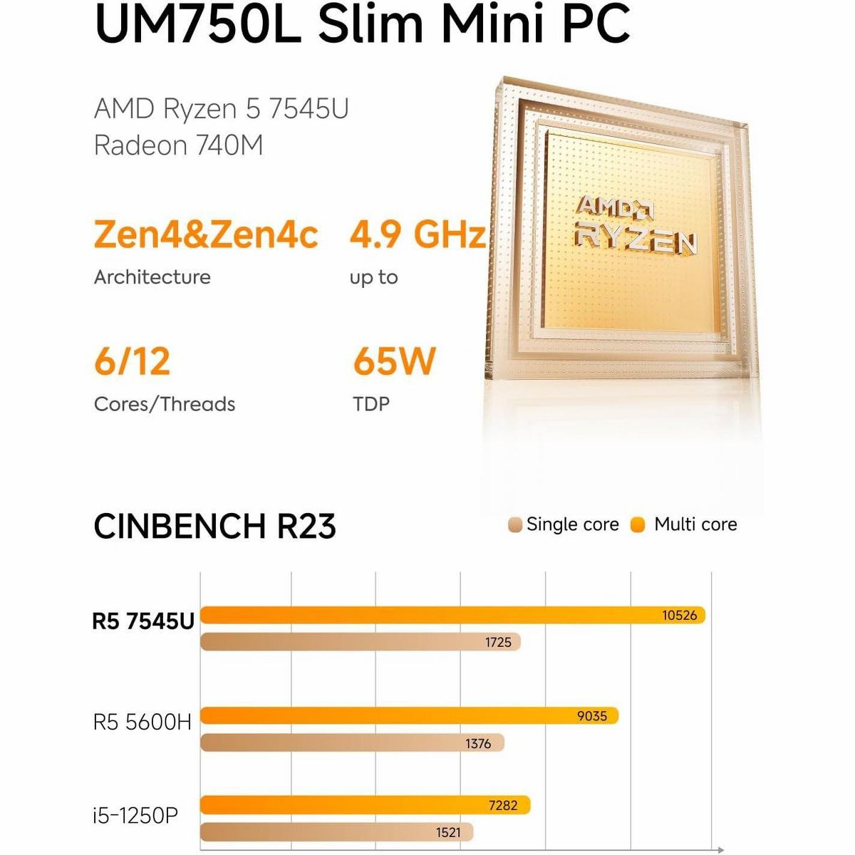 Minisforum UM750L Slim Mini Desktop PC, AMD Ryzen 5 7545U, 16GB Memory, 1TB SSD, Windows 11 pro