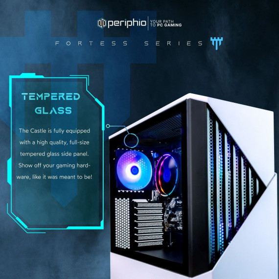 [More About the System] Part of our Fortress Series, the Castle features a high-quality, bold design, with 2 large 140mm RGB front fans behind a high-quality fascia, supported by an ATX footprint. Its all-white design is clean and vibrant, and the tempered glass side-panel allows viewers to see inside so you can show off your hardware, just like it was meant to be! Positioned as the perfect entry into PC Gaming, the Periphio Castle embodies a future-proof design and plenty of PSU overhead for the budding PC enthusiast!
