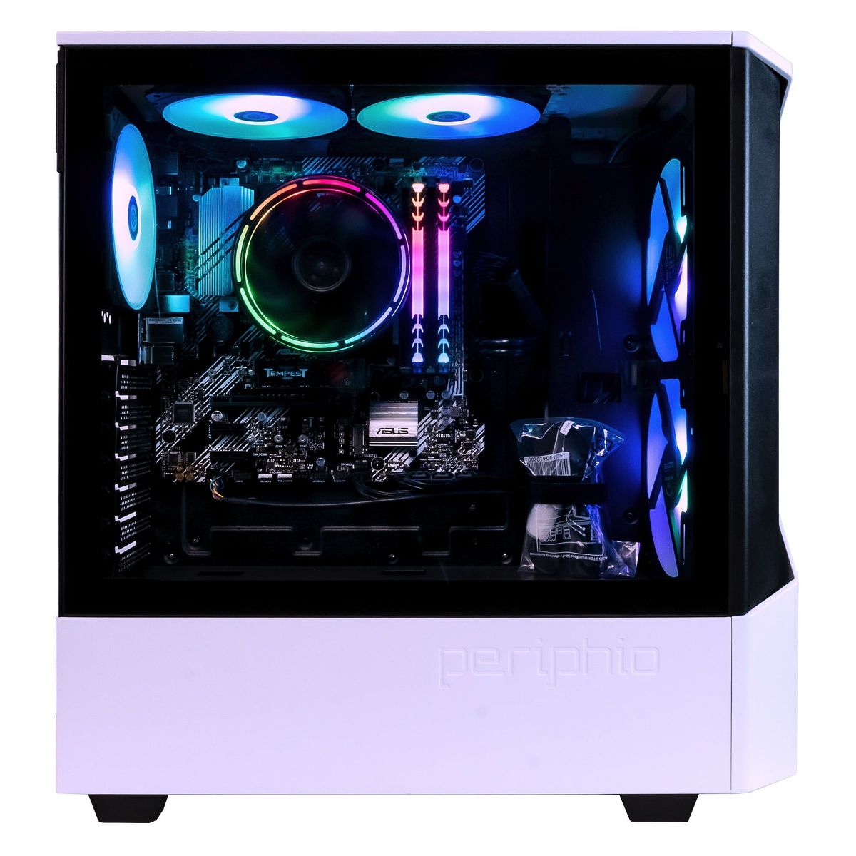 [More About the System] Part of our Fortress Series, the Castle features a high-quality, bold design, with 2 large 140mm RGB front fans behind a high-quality fascia, supported by an ATX footprint. Its all-white design is clean and vibrant, and the tempered glass side-panel allows viewers to see inside so you can show off your hardware, just like it was meant to be! Positioned as the perfect entry into PC Gaming, the Periphio Castle embodies a future-proof design and plenty of PSU overhead for the budding PC enthusiast!