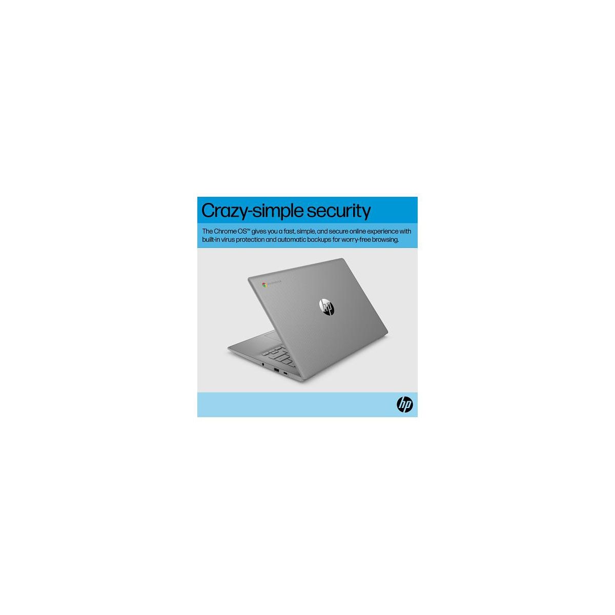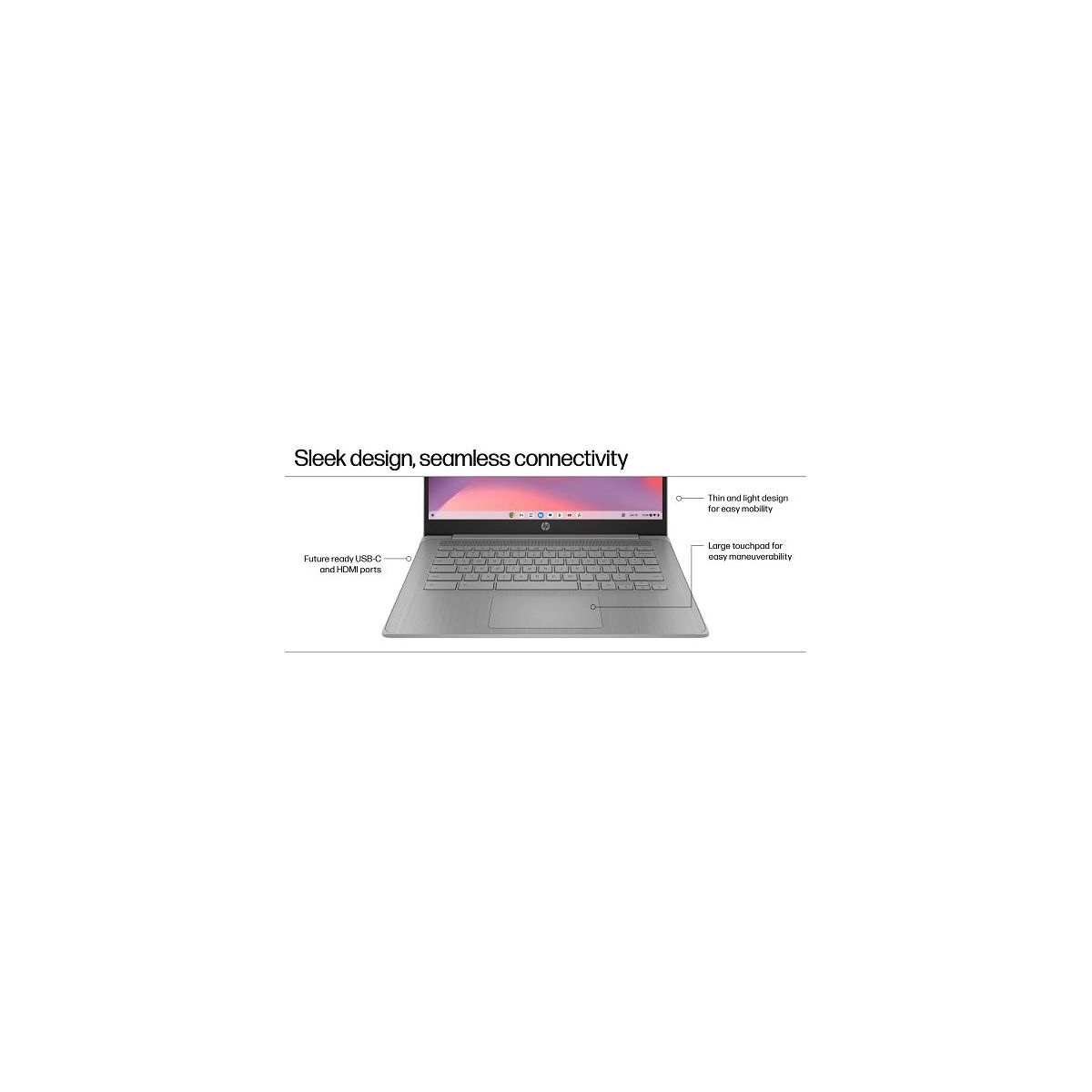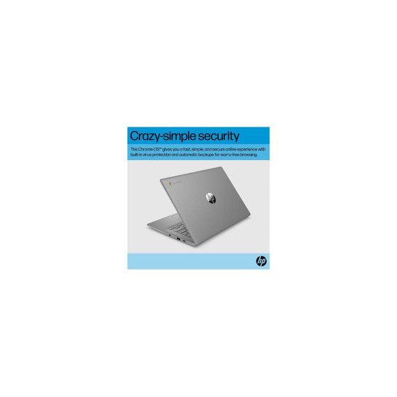Overview - Stay productive and entertained with the HP Chromebook 14”. Powered by an Intel® Processor and ample storage, it’s perfect for work and fun, with built-in Google apps and other popular apps. Enjoy HD video calls, streaming, and gaming on the micro-edge display, plus worry-free performance with automatic updates and built-insecurity. Features Responsive performance for all your needs - Stay productive with the Intel® Processor, lots of storage and essential tools and apps for work and play. More streaming. More playing. - Experience HD on a 14” micro-edge display, with Google apps and faves for streaming, gaming, and more. Worry free with built-in security - Breathe easy with built-in virus protection and automatic backups for worry-free performance. Built for a better tomorrow - This PC's incorporates parts with ocean-bound plastic and is EPEAT Silver with Climate+ Registered. Disclaimers - Multi-core is designed to improve performance of certain software products. Not all customers or software applications will necessarily benefit from use of this technology. Performance and clock frequency will vary depending on application workload and your hardware and software configurations. Intel’s numbering, branding and/or naming is not a measurement of higher performance. - Wireless access point and internet service required and sold separately. - Google Play Store apps sold separately and not included. - High definition (HD) content required to view HD images. - Laptops manufactured with recycled ocean-bound plastic material in product speaker enclosures, recycled aluminum material in product cover and post-consumer recycled plastic in keycaps. Percentage of material contained in each component varies by product. - See www.epeat.net for registration status and tier levels by country. - High-definition (HD) content required to view HD images. Graphics output may be limited based on the maximum resolution of the display. 4K content required to view full 4K images. - High-definition (HD) content is required to view HD images. - All performance specifications represent the typical specifications provided by HP's component manufacturers; actual performance may vary either higher or lower. - The flicker-free capability eliminates screen flickering through integrating DC-dimming LED backlights. - ENERGY STAR and the ENERGY STAR logo are registered trademarks of the U.S. Environmental Protection Agency. - Percentage of ocean-bound plastic contained in each component varies by product. - Recharges your battery up to 50% within 45 minutes when the system is off using “shut down” command, using HP adapter provided with the notebook or recommended power adapter disclosed in specifications (see http://store.hp.com). After charging has reached 50% capacity, charging speed will return to normal speed. Charging time may vary +/- 10% due to System tolerance. Available on select HP products. - Wireless access point and internet service required and sold separately. Availability of public wireless access points limited. Wi-Fi 6 is backwards compatible with prior 802.11 specs. Wi-Fi 6 is designed to support gigabit data rate when transferring files between two devices connected to the same router. Requires a wireless router, sold separately, that supports 80MHz and higher channels. Wi-Fi 6 (802.11ax) is not supported in Belarus where Wi-Fi settings will be optimized to local regulatory requirements (802.11ac). Bluetooth® 5.4 operation requires Microsoft OS/Chrome OS support. Until Microsoft OS/Chrome OS support is available, Bluetooth® 5.4 will function as Bluetooth® 5.3 or lower. Bluetooth® is a trademark owned by its proprietor and used by HP Inc. under license. - Actual throughput may vary. - Features may require software or other 3rd party applications to provide the described functionality.