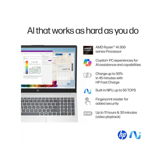 The HP OmniBook 3 Next Gen AI PC comes with the powerful AMD Ryzen AI processor. Go from shopping to streaming to keeping up with friends with speedy connections and ample storage. Unlock transformational AI PC experiences with an AMD Ryzen AI processor. Designed for users to experience pure speed, responsiveness, and power efficient AI processing for Copilot+ PCs. Enjoy clearer team conversations with AI Noise reduction. Using artificial intelligence, it filters out background noise in multi-person environments and captures multidirectional sound with spatial awareness. Brilliant new AI features designed to take your day from ordinary to extraordinary. The HP OmniBook 3 is tomorrow’s tech within your reach..