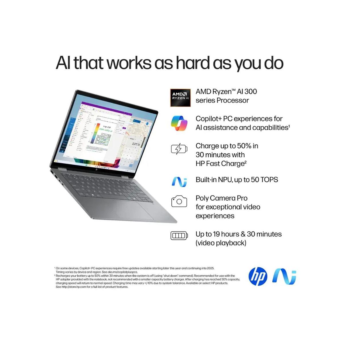 Let creativity reign with the HP OmniBook X Flip 14 Next Gen AI PC. With 4 versatile modes, this thin and light Next Gen AI PC enables you to work and play from anywhere, at any angle. AI-boosted power and speed, along with an all-day, fast-charge battery, keeps you going. While a 2K IPS touch screen provides the best possible view. Copilot+ PC will bring exclusive on-device AI experiences designed to accelerate productivity and creativity..