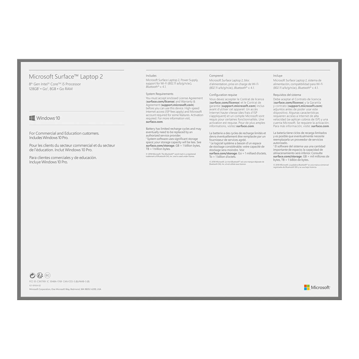 Microsoft Surface Laptop 2 Platinum, Model 1769 (LQL-00001) Intel i5, 8GB RAM, 128GB SSD, Windows 10 with Microsoft Office 365 Home PC/Mac Download