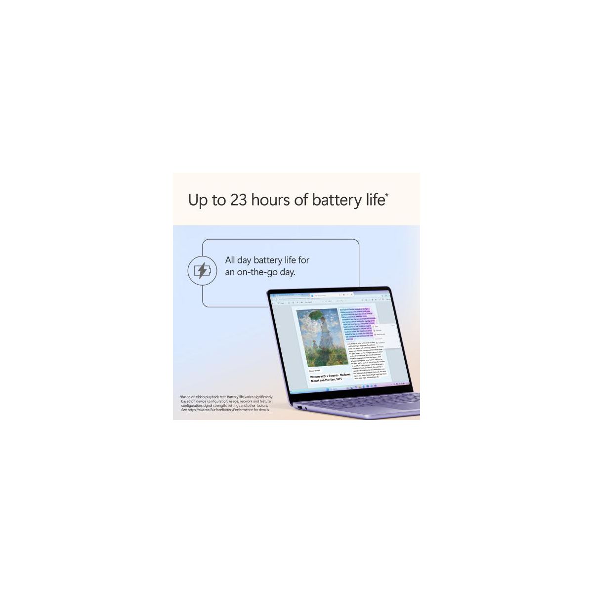 Please note this product releases on May 20th, 2025 and will not be made available until that date. Meet Surface Laptop 13", a Copilot+ PC and the most portable Surface Laptop. With built-in AI experiences and plenty of colors, it delivers unbeatable intelligence, value, and style. And you can leave your charger at home because this 13" touchscreen powerhouse boasts all-day battery life. Copilot+ PC. A new AI era begins Turn your ideas from text prompts into generated artwork. With Recall*, search across time to find the content you need. Understand new languages instantly with Live Captions. Copilot+ PCs powered by the Snapdragon X Plus processor come with 45 Trillion Operations Per Second of NPU power, and theyre all set to transform the way you create, find and communicate. Brilliant Display Immersive Brilliance or Incredible image quality The 13" PixelSense Flow touchscreen offers a vibrant and immersive viewing experience. All-day Energy Up to 23 hours of battery life for local video playback for uninterrupted streaming. Power up Built with the latest Qualcomm Snapdragon X Plus 8 Core processors, Surface Laptop delivers powerful performance and AI accelerated power. Turbocharged NPU Surface Laptop features the Qualcomm Hexagon NPU that delivers up to 45 TOPs designed to accelerate AI experiences. Express your style Surface Laptop comes in three new colors Violet, Ocean, and Platinum. The ports you need Charge on-the-go, transfer data fast, or create the ultimate desktop set up with two USB-C 3.2 ports. Type with perfection Optimal key travel for swift, accurate typing and enhance your productivity with a large precision touchpad. You are the security Windows Hello is a faster, more personal, more secure way to get instant access to your devices using only your fingerprint there's no password to remember.