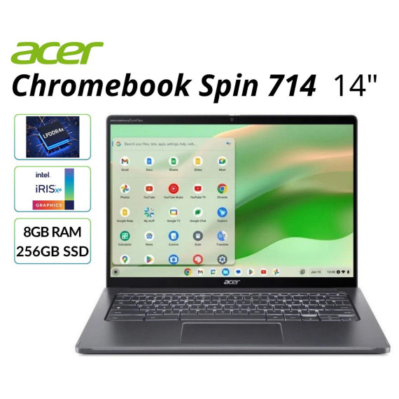 Discover the seamless performance of the Acer Spin 714 14" Touchscreen Chromebook Core i5-1335U 1.3GHz 8GB 256GB ChromeOS - Manufacturer Refurbished, featuring state-of-the-art processors and enhanced graphics for superior productivity and entertainment. Its sleek design and long-lasting battery make it perfect for professionals on the move. Enjoy a vibrant display and responsive computing, wherever you go. This is a Manufacturer Refurbished Product.