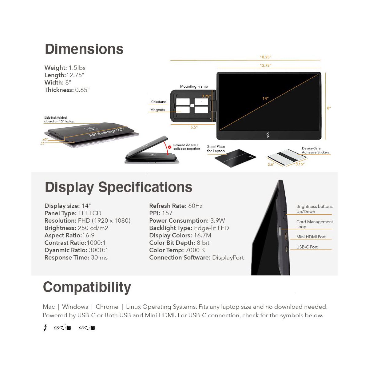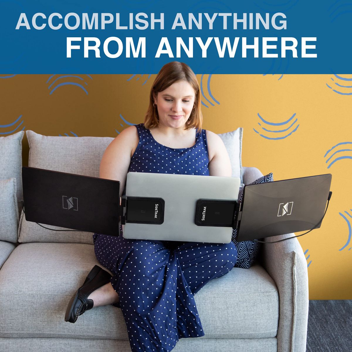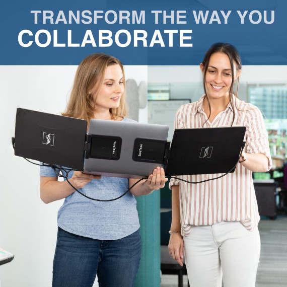 Instantly triple your laptop screen workspace with this game-changing attachable portable monitor technology! SideTrak Swivel Triple includes two FHD IPS monitors that magnetically attach to the back of your laptop with metal plates so you can effortlessly work anywhere with three screens. SideTrak Swivel is the most portable monitor on the market and the perfect laptop companion whether you are working from home, in the office, or on-the go! UNSTOPPABLE PRODUCTIVITY Whether you are on a zoom call or working on an important project, three screens allow you to easily reference documents and take notes with more screen real estate. PRODUCTIVITY THAT MOVES WITH YOU SideTrak Swivel Triples lightweight, durable, and slim design is built for your life on-the-go! It weighs only 3lbs and fits in most work bags so that you can carry it between your home and office. TRANSFORM THE WAY YOU COLLABORATE Conveniently share your amazing ideas with coworkers and clients! These portable monitors are designed to mirror, rotate 270, swivel 360 and autorotate ENJOY LIFE BEYOND WORK Relax after work by switching your new portable monitors to freestanding mode and connecting to a PlayStation, Xbox, or Switch. COMPATIBLE WITH YOUR DEVICE These portable monitors do not require a download and is compatible with most devices and operating systems including Mac, PC, Chrome, PS4, Xbox, & Switch. Its compact, innovative attachment is designed to fit any laptop size and its mounting frame allows it to transition to a freestanding monitor. This setup is not compatible with any MacBook with an M1 chip without a docking station. Check the ports on your laptop prior to purchasing this bundle, each monitor requires 1 USB-C® port with power or both a USB-C®/A and HDMI port.