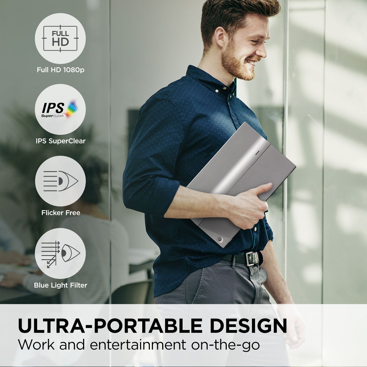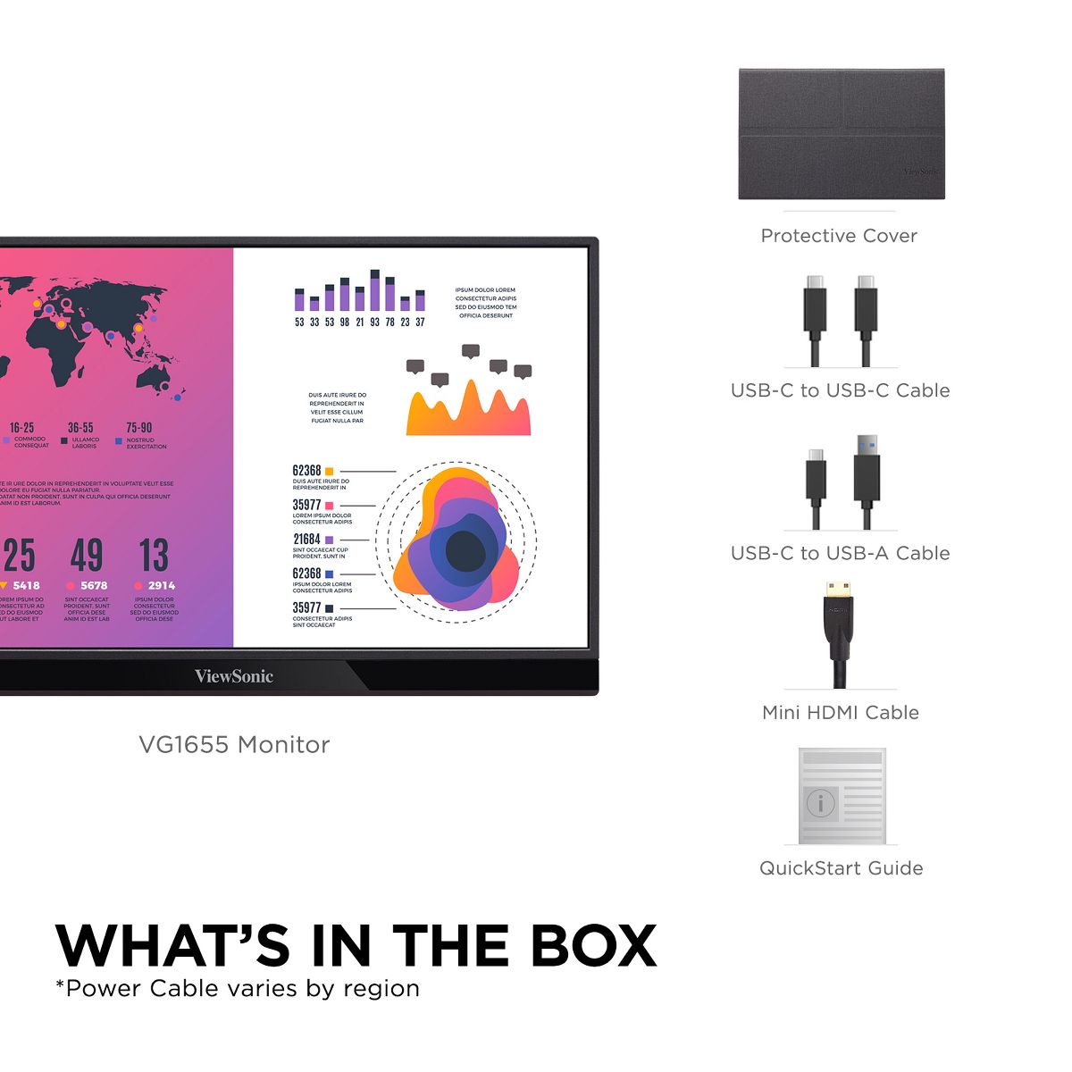 The ViewSonic VG1655 is a portable 15.6-Inch monitor designed for productivity on the go. Built for business travelers, remote workers, and digital nomads, the VG1655 can serve as a complementary screen to a laptop or tablet for boosted productivity. With an anti-glare screen and Full HD 1080p resolution, this monitor delivers a crystal-clear viewing experience so users can see more and do more for a more efficient workflow. A USB Type-C port enables quick and easy transmission of video, and audio. A second USB Type-C port also delivers up to 60W of two-way power: a connected laptop can power the VG1655, OR the VG1655 can power a connected laptop via a USB-C power bank or AC adapter and outlet. Measuring less than an inch thick and weighing under two pounds, the ultra-slim VG1655 perfectly fits into any bag, briefcase, or backpack so you can work wherever life takes you.....