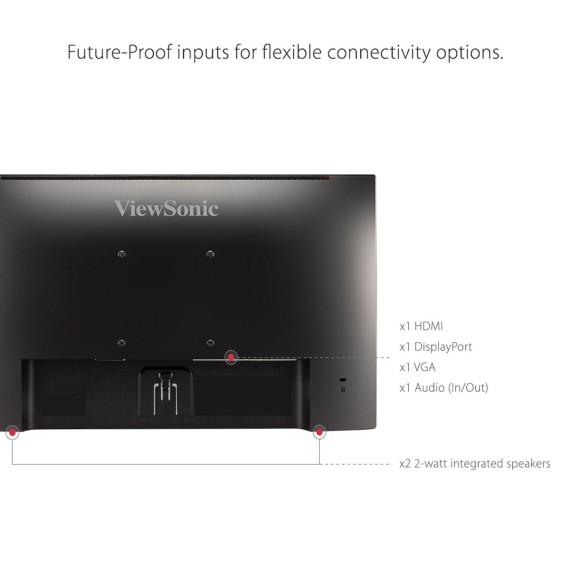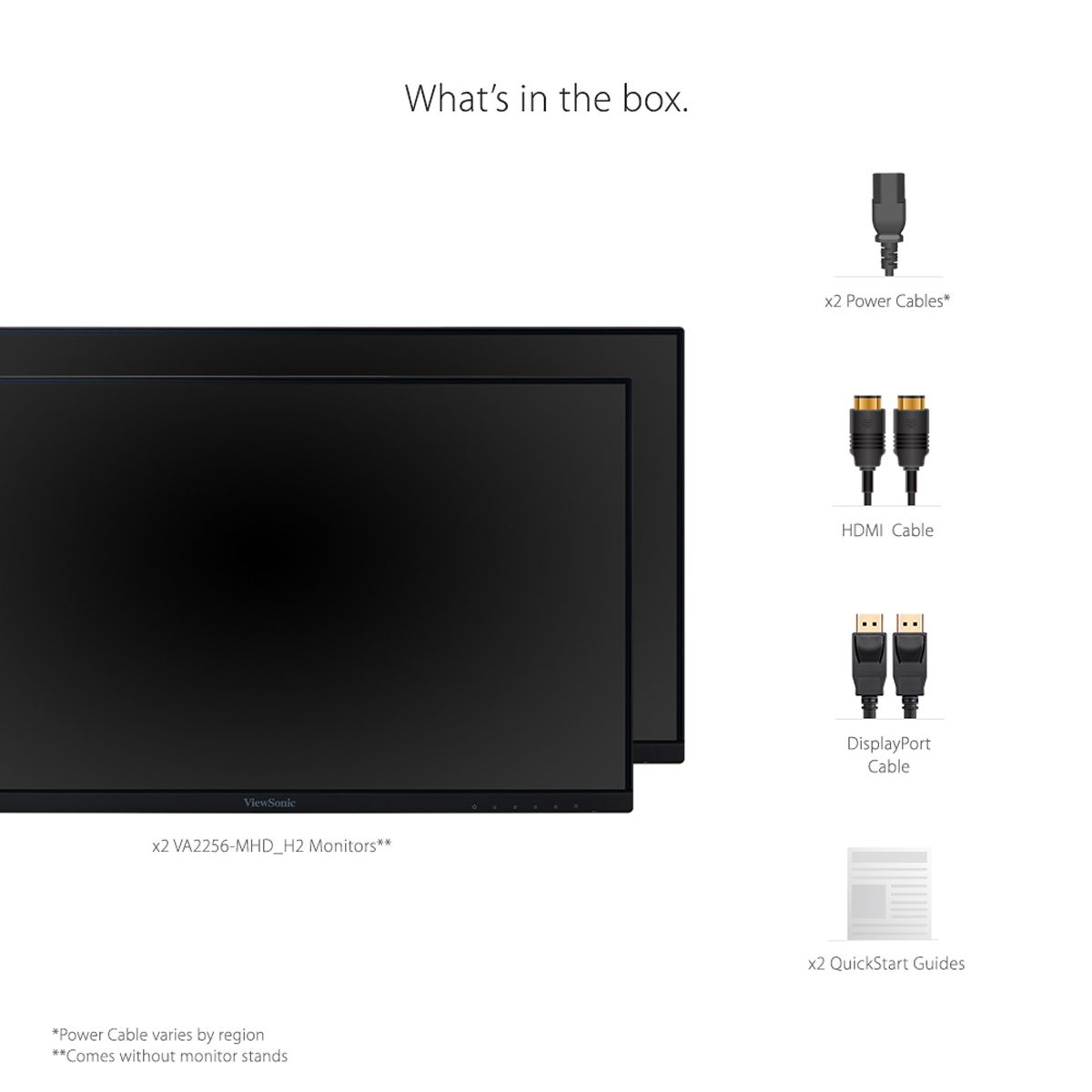 The ViewSonic VA2256-mhd_H2 dual monitor pack delivers an efficient end-to-end enterprise experience. From easy installation, to recycling, to long-term reliability, this dual monitor solution reduces the total cost of ownership beyond the initial purchase price. Sold as a dual pack of monitors without monitor stands, the VA2256-mhd_H2 ships in biodegradable packaging to minimize recycling costs and waste. Standard VESA-compatible mounting offers easy dual-screen installation, while a 3-sided thin bezel design provides a seamless viewing experience for multi-monitor setups. SuperClear IPS panel technology delivers wide-angle viewing and incredibly vivid colors. Extensive connectivity options include VGA, HDMI, and DisplayPort so that you can connect to a variety of HD and analog devices today and tomorrow.