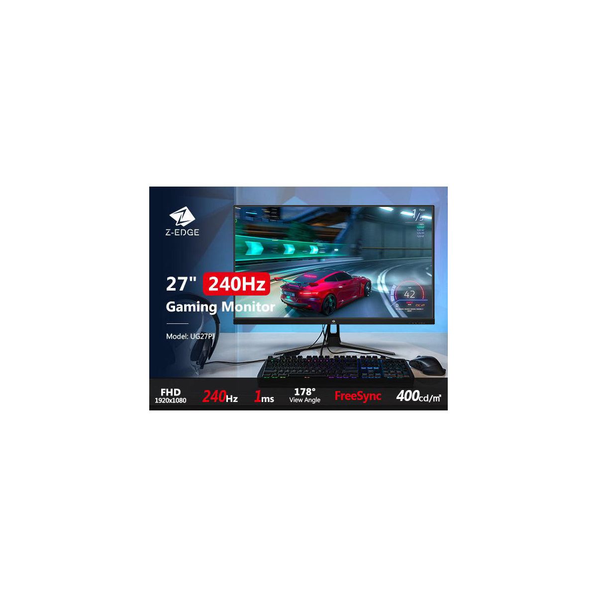 Z-EDGE 27" IPS Gaming Monitor 1920x1080, 1ms Frameless LED, AMD Freesync Premium, Display Port HDMI