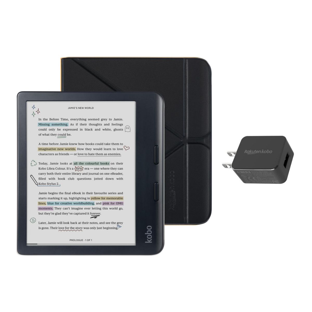 Introducing our most inspiring eReader yet: the new Kobo Libra Colour. Bring magic to your margins by annotating your pages, organizing your thoughts, and highlighting inspiring lines, all in color. With Kobo Stylus 2 compatibility, you can dive deeper into your favorite stories by marking up meaningful moments and highlighting powerful passages in the eBooks you love. Personalize your Kobo Libra Colour by choosing the case bundle that best matches your style. SleepCovers are available in Black, Butter Yellow, Dusk Blue, and Garden Green. Notebook SleepCovers are available in Sand Beige and Black. A Clear shell case is also available. Bundle options also allow adding the AC adapter and/or Stylus 2.