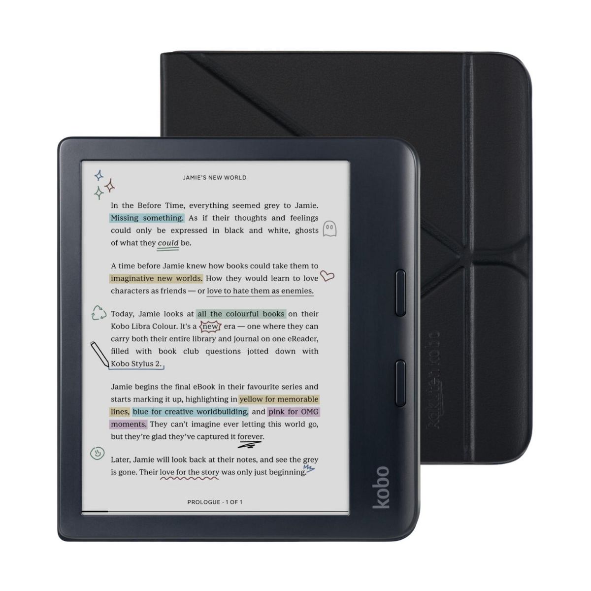 Introducing our most inspiring eReader yet: the new Kobo Libra Colour. Bring magic to your margins by annotating your pages, organizing your thoughts, and highlighting inspiring lines, all in color. With Kobo Stylus 2 compatibility, you can dive deeper into your favorite stories by marking up meaningful moments and highlighting powerful passages in the eBooks you love. Personalize your Kobo Libra Colour by choosing the case bundle that best matches your style. SleepCovers are available in Black, Butter Yellow, Dusk Blue, and Garden Green. Notebook SleepCovers are available in Sand Beige and Black. A Clear shell case is also available. Bundle options also allow adding the AC adapter and/or Stylus 2.