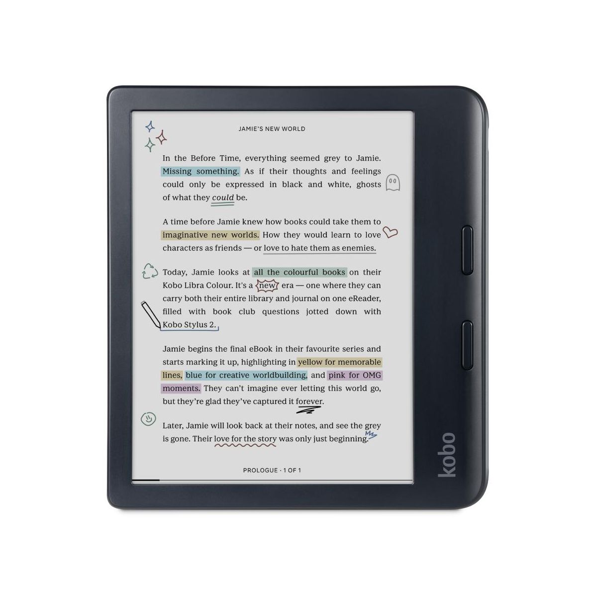 Introducing our most inspiring eReader yet: the new Kobo Libra Colour. Bring magic to your margins by annotating your pages, organizing your thoughts, and highlighting inspiring lines, all in color. With Kobo Stylus 2 compatibility, you can dive deeper into your favorite stories by marking up meaningful moments and highlighting powerful passages in the eBooks you love. Personalize your Kobo Libra Colour by choosing the case bundle that best matches your style. SleepCovers are available in Black, Butter Yellow, Dusk Blue, and Garden Green. Notebook SleepCovers are available in Sand Beige and Black. A Clear shell case is also available. Bundle options also allow adding the AC adapter and/or Stylus 2.