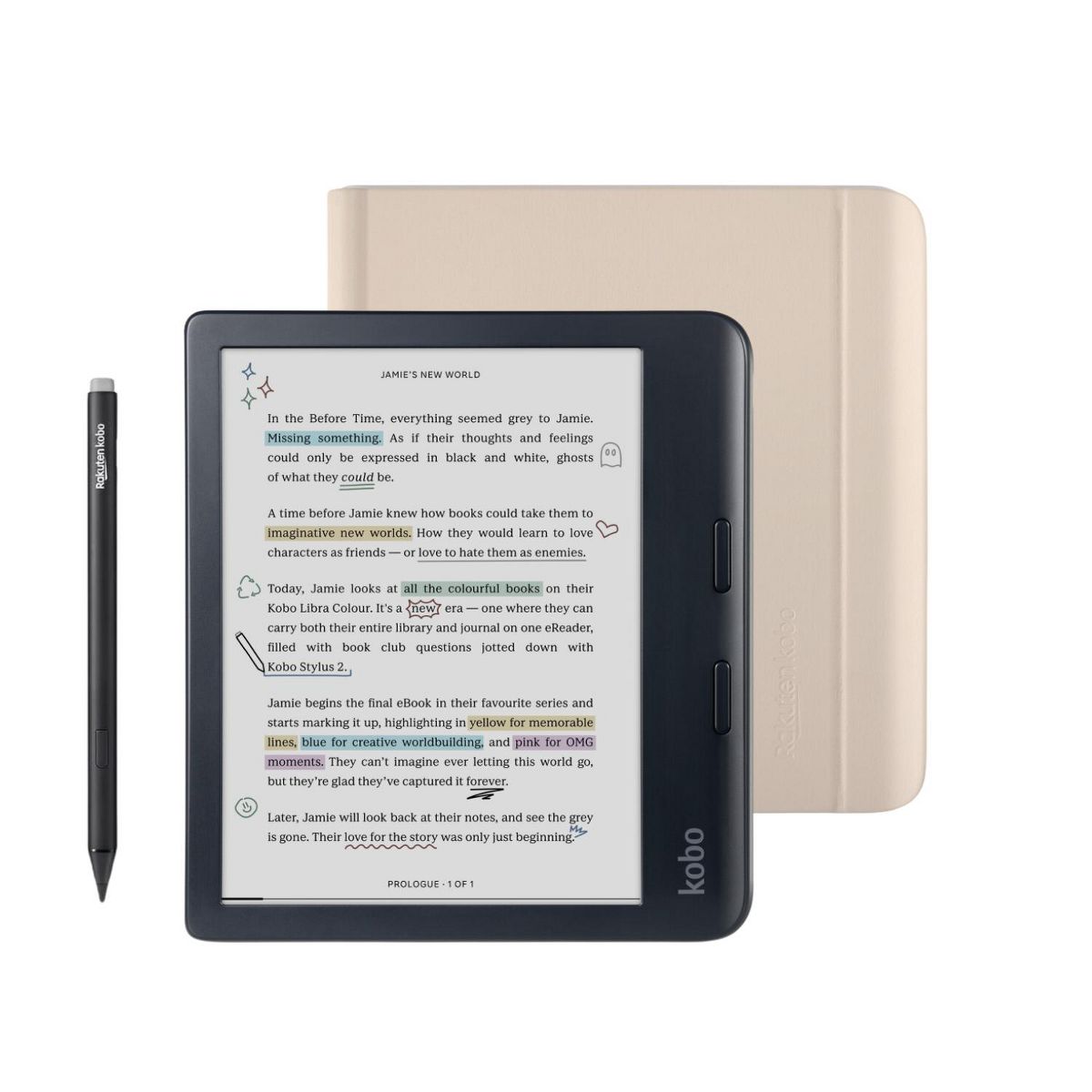 Introducing our most inspiring eReader yet: the new Kobo Libra Colour. Bring magic to your margins by annotating your pages, organizing your thoughts, and highlighting inspiring lines, all in color. With Kobo Stylus 2 compatibility, you can dive deeper into your favorite stories by marking up meaningful moments and highlighting powerful passages in the eBooks you love. Personalize your Kobo Libra Colour by choosing the case bundle that best matches your style. SleepCovers are available in Black, Butter Yellow, Dusk Blue, and Garden Green. Notebook SleepCovers are available in Sand Beige and Black. A Clear shell case is also available. Bundle options also allow adding the AC adapter and/or Stylus 2.