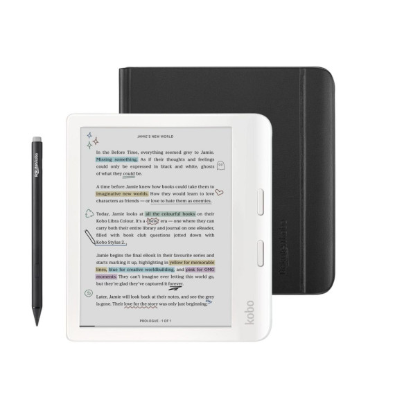 Introducing our most inspiring eReader yet: the new Kobo Libra Colour. Bring magic to your margins by annotating your pages, organizing your thoughts, and highlighting inspiring lines, all in color. With Kobo Stylus 2 compatibility, you can dive deeper into your favorite stories by marking up meaningful moments and highlighting powerful passages in the eBooks you love. Personalize your Kobo Libra Colour by choosing the case bundle that best matches your style. SleepCovers are available in Black, Butter Yellow, Dusk Blue, and Garden Green. Notebook SleepCovers are available in Sand Beige and Black. A Clear shell case is also available. Bundle options also allow adding the AC adapter and/or Stylus 2.