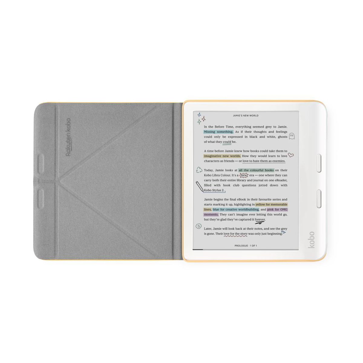 Introducing our most inspiring eReader yet: the new Kobo Libra Colour. Bring magic to your margins by annotating your pages, organizing your thoughts, and highlighting inspiring lines, all in color. With Kobo Stylus 2 compatibility, you can dive deeper into your favorite stories by marking up meaningful moments and highlighting powerful passages in the eBooks you love. Personalize your Kobo Libra Colour by choosing the case bundle that best matches your style. SleepCovers are available in Black, Butter Yellow, Dusk Blue, and Garden Green. Notebook SleepCovers are available in Sand Beige and Black. A Clear shell case is also available. Bundle options also allow adding the AC adapter and/or Stylus 2.