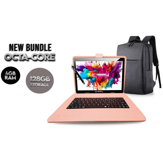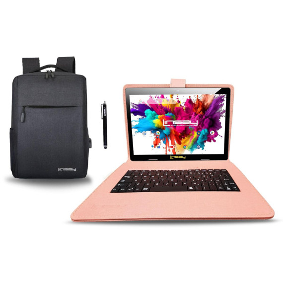 LINSAY® 10.1" OCTA CORE 128GB STORAGE ANDROID 15 BUNDLE with DESIGNER CLOTH KEYBOARD CASE BLUE and STYLISH COMPACT BACKPACK and PEN STYLUS