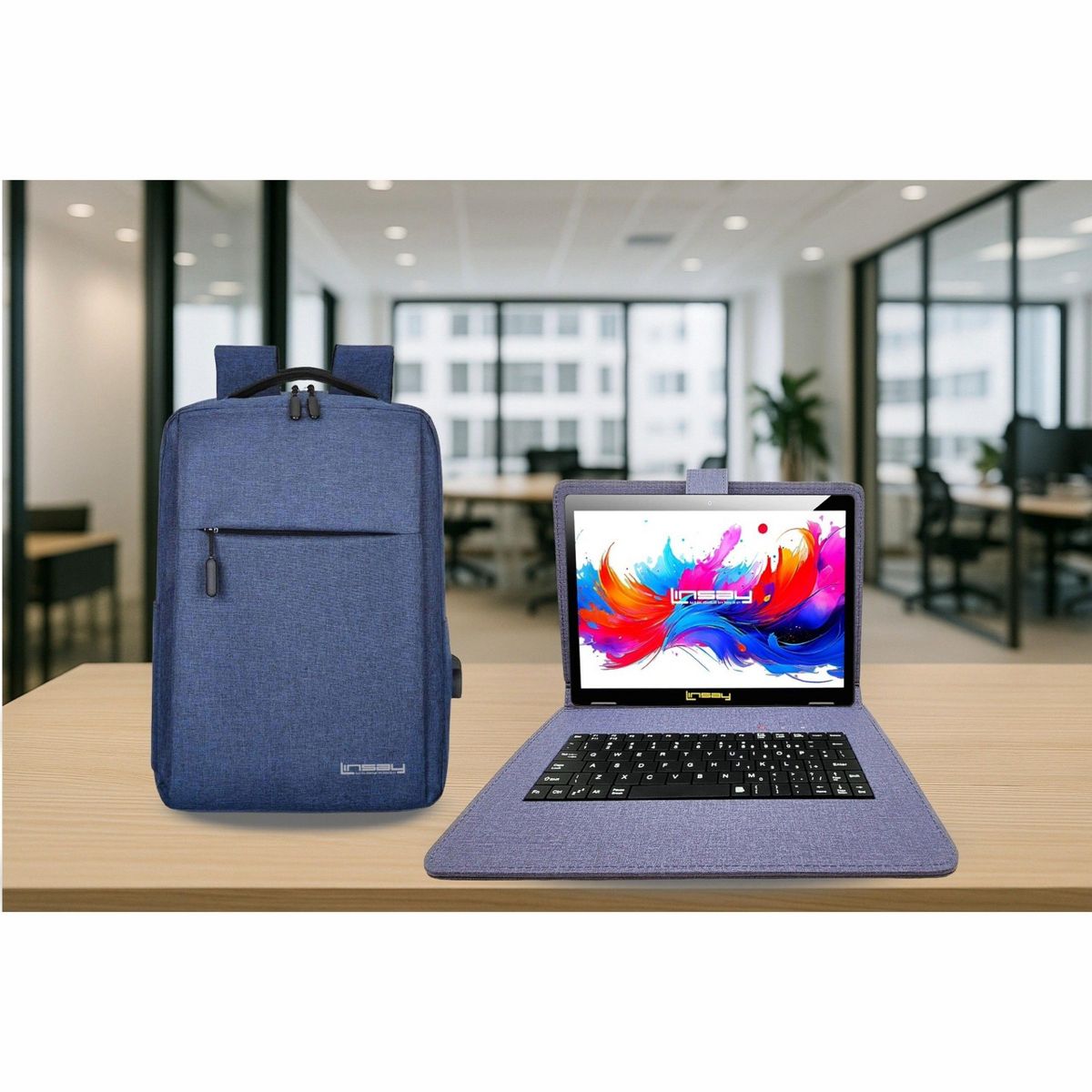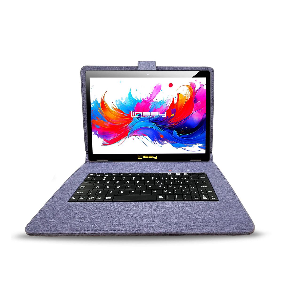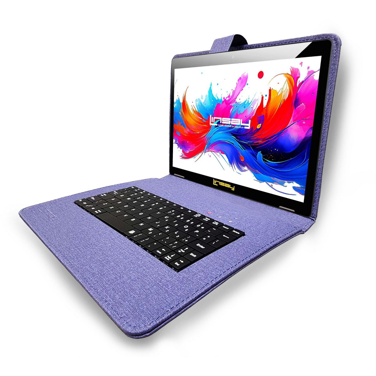 LINSAY® 10.1" Octa Core 256GB STORAGE Android 15 BUNDLE with BLUE DESIGNER CLOTH KEYBOARD CASE and STYLISH COMPACT BACKPACK