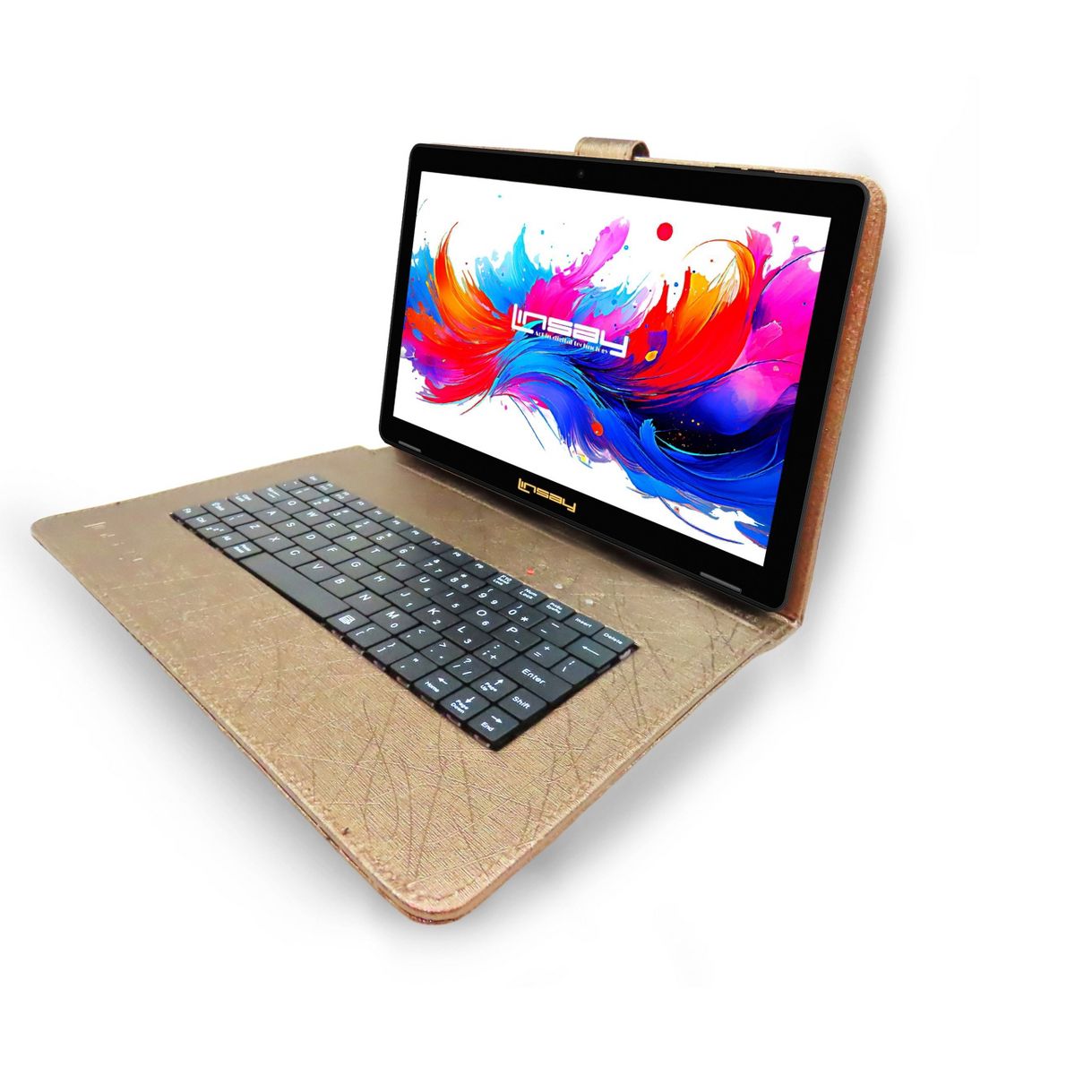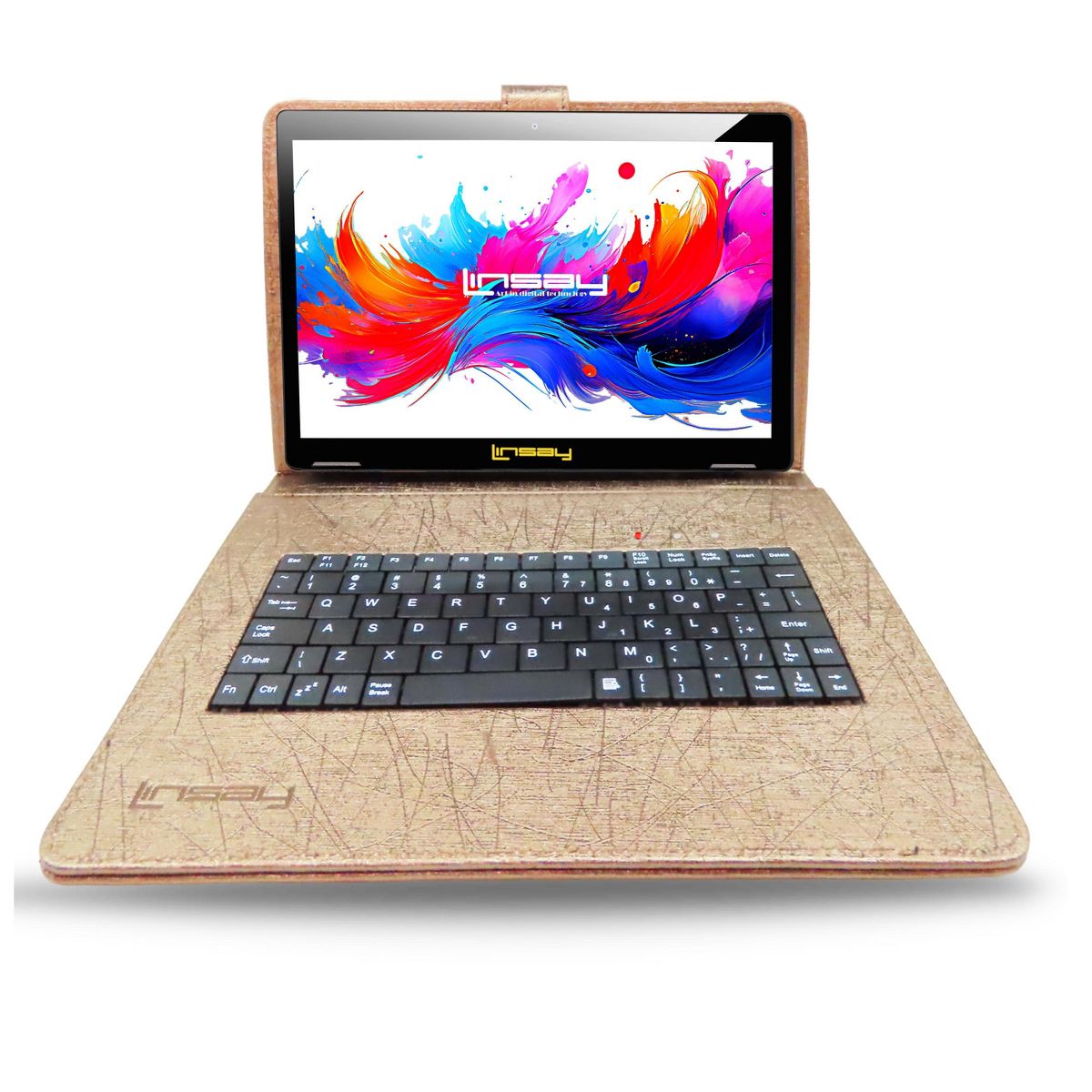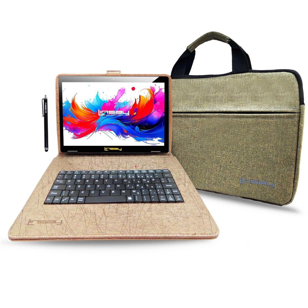 LINSAY® 10.1" Octa Core 256GB STORAGE Android 15 BUNDLE with BROWN UNIQUE ORACLE KEYBOARD CASE and TABLET BRIEFCASE