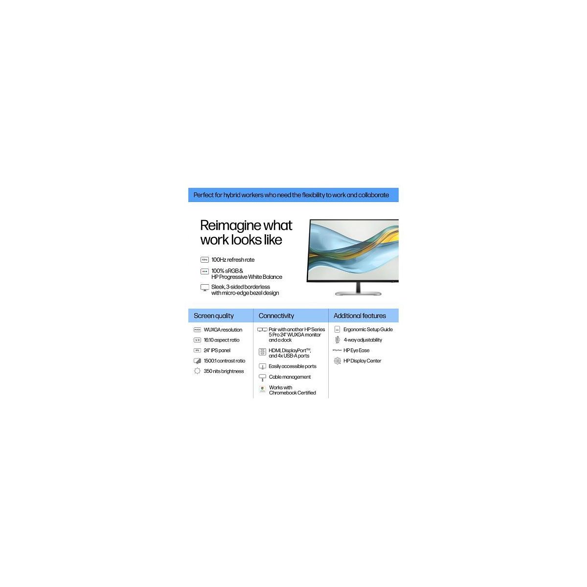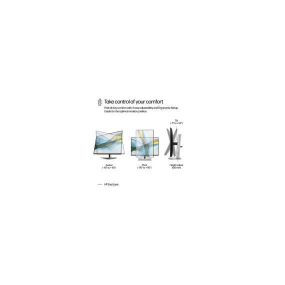 Overview - Get more out of your workday with the HP Series 5 Pro 24” WUXGA Monitor. Create the setup that works for the way you work, wherever you work, with refined visual clarity and adjustable comfort built into a sleek, modern design. Height Adjust/Tilt/Swivel/Pivot What's in the box? - Monitor; DisplayPort™ cable; HDMI cable; Warranty card; USB Type-B to A cable; Quick Setup Poster; AC power cord Disclaimers - All performance specifications represent the typical specifications provided by HP's component manufacturers; actual performance may vary, either higher or lower. - HP's Progressive White Balance feature is designed to calibrate 100% full white on HP Series 5 Pro monitors. This adjustment is intended to align the white point more closely among various HP Series 5 Pro monitors. However, due to the nature of monitors, perceptible differences in the white color may still occur when the monitors are viewed from varying angles. - Dock sold separately. Both HP Series 5 Pro 24" WUXGA - 524pn monitors need to be connected to the dock for a dual display setup. - HP Series 5 Pro 24" WUXGA - 524pn monitor sold separately. - Ergonomic Setup Guide is available through HP Display Center. Host PC requires Windows 10 or higher. HP Display Center is available on the Microsoft store. - Recycled plastic is expressed as a percentage of the total weight plastic. Post-consumer recycled is based on the definition set in the EPEAT® standard for computers, IEEE 1680.1-2018 standard. Recycled metal is expressed as a percentage of the total weight of the metal according to ISO 14021 definitions for metal parts over 25 grams. - 100% of paper-based packaging made from sustainably sourced, certified, and recycled fibers. - Based on internal testing of HP Series 7 Pro and HP Series 5 Pro monitors with USB Type-C® or HDMI connections to devices on macOS and Windows, March 2024 and September 2024. Requires USB Type-C® or HDMI connectivity. Some features may not be supported.