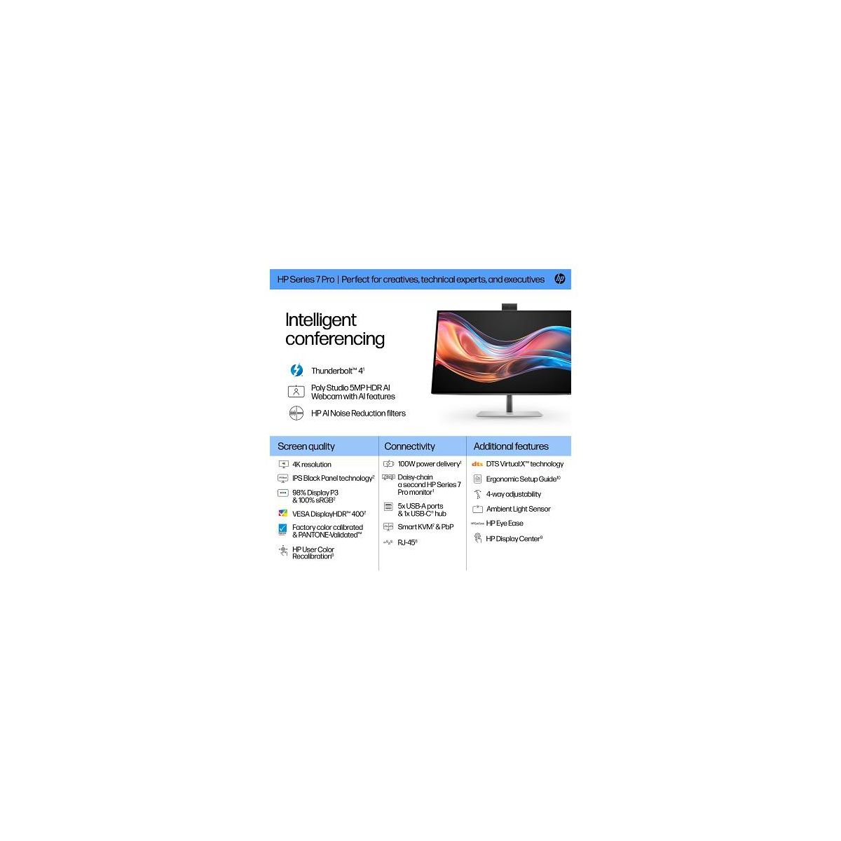Overview - Effortlessly make a great impression with built-in AI on the HP 27" 4K Conferencing Monitor. Intelligent conferencing delivers productive, high-quality collaboration every time. And it's all on a dazzling display with powerful Thunderbolt™ 4. Docking monitor What's in the box? - Monitor; Thunderbolt™ cable; DisplayPort™ cable; HDMI cable; Warranty card; AC power cable; Quick Setup Poster; 1 USB Type-C® to Type-A cable; Color calibration report; VESA mount adapter Disclaimers - For full Thunderbolt™ 4 functionality, host PC must support Thunderbolt™ 4. - A DreamColor-class display is defined by 1) Factory calibrated color accuracy with Delta E < 2 for each measured color, 2) 10-bit color (either True 10-bit or 8bit +FRC) , and 3) a color gamut of 98% Display P3 or greater. - All performance specifications represent the typical specifications provided by HP's component manufacturers; actual performance may vary, either higher or lower. - Number of colors available through A-FRC technology. - Recycled plastic content percentage is based on the definition set in the IEEE 1680.1-2018 EPEAT® standard. Plastics consist of 90% Post-Consumer Recycled, with 85% post-consumer recycled plastics + 5% Ocean-Bound Plastics (PET). - 100% outer box/corrugate cushion packaging made from sustainably sourced certified and recycled fibers. Fiber cushions made from 100% recycled wood fiber and organic material. Any plastic cushions are made from >90% recycled plastic. Excludes plastic bags and plastic foam sheeting. - Based on internal testing of HP Series 7 Pro and HP Series 5 Pro monitors with USB Type-C® or HDMI connections to devices on macOS and Windows, March 2024 and September 2024. Requires USB Type-C® or HDMI connectivity. Some features may not be supported.