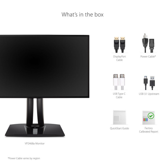 The VP2468a is a 24 (23.8 viewable) Full HD monitor that delivers color accuracy crucial for professional applications. With a sleek frameless design and edge-to-edge SuperClear IPS panel, this monitor provides an incredible viewing experience ideal for content creation and enterprise workstations. USB-C connectivity helps to simply your workspace by delivering audio, video, data and up to 65W of power delivery over a single universal cable. In addition, DisplayPort out enables seamless daisy chaining to a second monitor. To ensure precise, uniform color, each of our monitors is factory calibrated to deliver an amazing Delta E<2 value for superior color accuracy. A 14-bit 3D look-up table generates a stunningly smooth palette of 4.39 trillion colors. Add to that 6-axis color adjustment functionality, and this monitor provides the ultimate color processing capability for professional applications.
