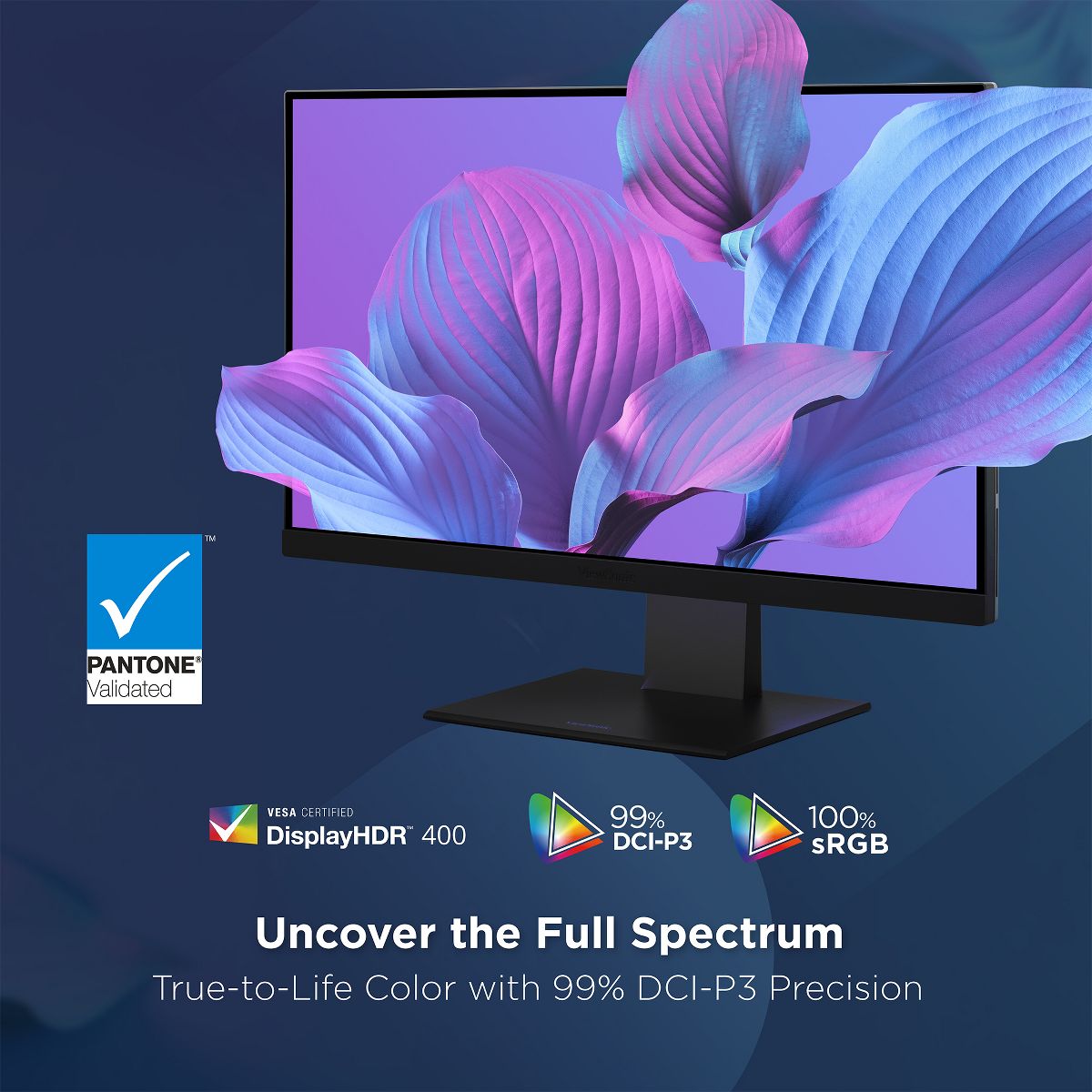 Elevate your MacBook experience with the powerful ViewSonic ColorPro® VP2788-5K, a sleek 27” monitor designed to integrate seamlessly into your Mac or PC ecosystem. Featuring stunning 5K (5120x2880) resolution and a 99% DCI-P3 color gamut, it provides vibrant and precise visuals to complement Apple’s renowned color performance. Seamless Thunderbolt 4 connectivity provides ultra-fast data transfer and up to 100W charging through a single cable, while also supporting daisy chaining of up to two 5K monitors for a seamless multi-display setup. Additional HDMI and DisplayPort options offer unmatched flexibility for various devices. In addition, an integrated USB-C and USB-A hub allows for connecting accessories and quick charging of your iPhone or iPad. A fully ergonomic stand allows you to customize height, tilt, and swivel for maximum comfort during long hours of use. Whether you're designing, editing, or enjoying media, this monitor’s exceptional performance transforms your workspace into a powerhouse of productivity with immersive visuals.