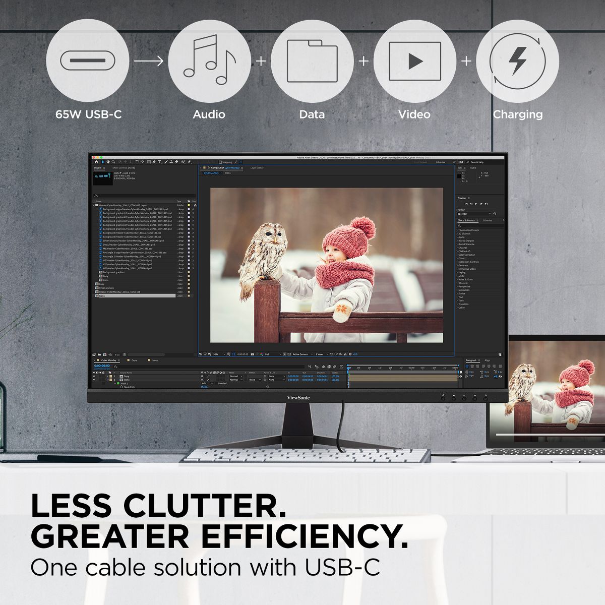 The ViewSonic VX3267U-4K is a 32” 4K UHD monitor that combines style with optimal versatility and functionality perfect for home use. With IPS Panel technology, this monitor offers best-in-class screen performance with ultra-wide viewing angles. A sleek edge-to-edge frameless design combined with stunning 3840 x 2160 resolution, provides incredibly sharp and detailed visuals, while HDR10 content support delivers a high dynamic range of vivid color and contrast for incredible screen performance.The latest USB 3.2 Type-C connectivity delivers charging up to 65W of power, video, and audio over a single cable, while HDMI and DisplayPort inputs keep you connected to your favorite devices...