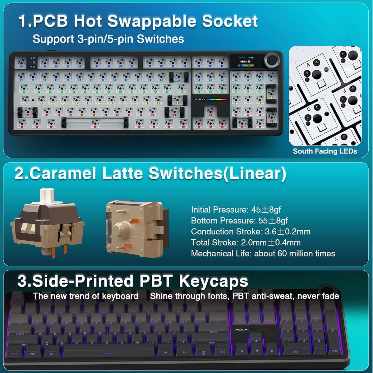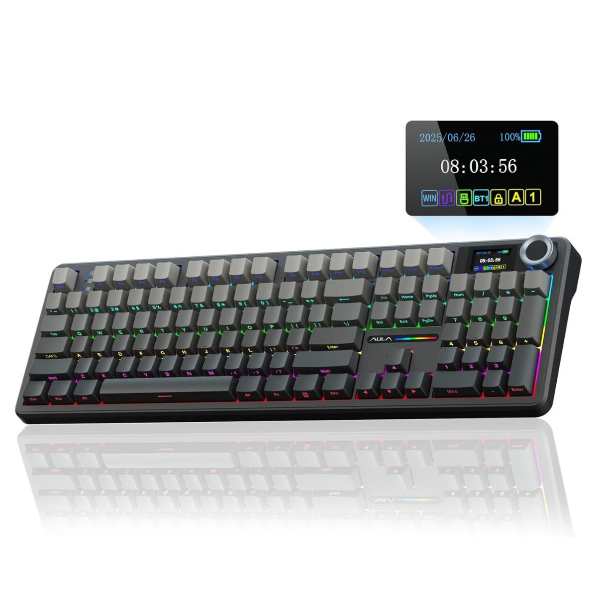 AULA F108 Pro, 104-Key Wireless Hot Swappable Mechanical Gaming Keyboard, RGB, Knob, 8000 mAH Battery, Digital Screen