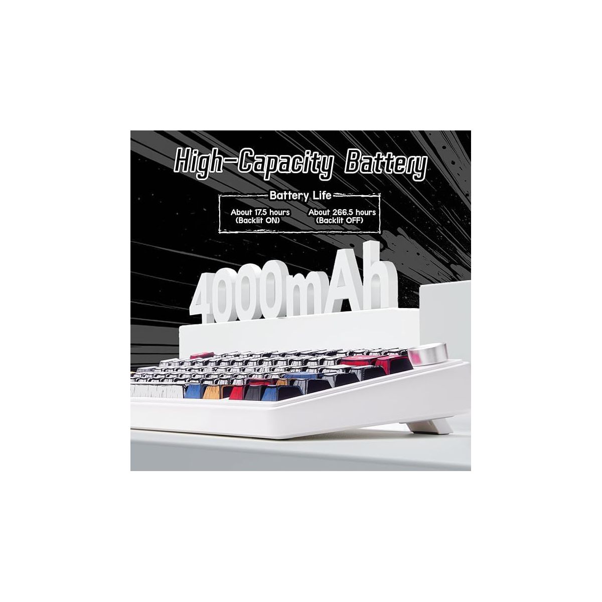 The F75 is a compact 75% keyboard with a gasket structure for soft, responsive typing. It features five-layer sound dampening, pre-lubed switches, and a 4000mAh battery. Supports Bluetooth, 2.4GHz, and USB-C, plus a control knob and hot-swappable keys.