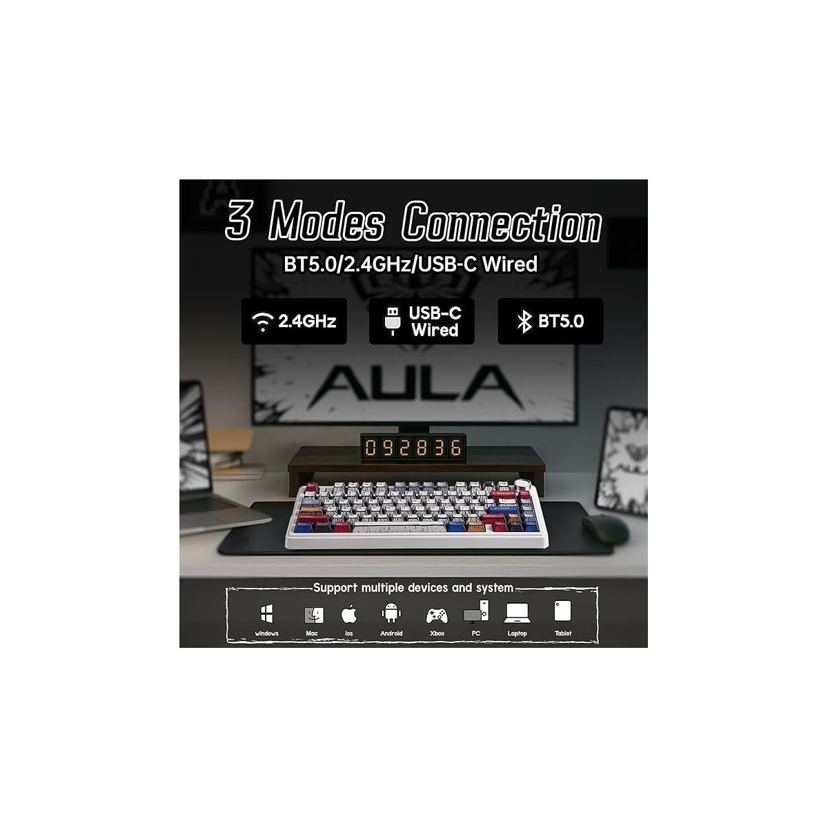 The Aula Gaming keyboard is amazing! Its battery life is super long! The lights are pretty, and they’re compatible with my computer. I use it every day, and I love it!