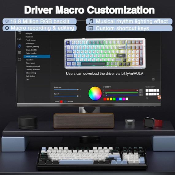 AULA F99 is a 96% layout keyboard with Bluetooth, USB, and 2.4GHz support. It includes RGB lighting, macro support, hot-swappable switches, PBT keycaps, and an 8000mAh battery. Suitable for gaming and work.