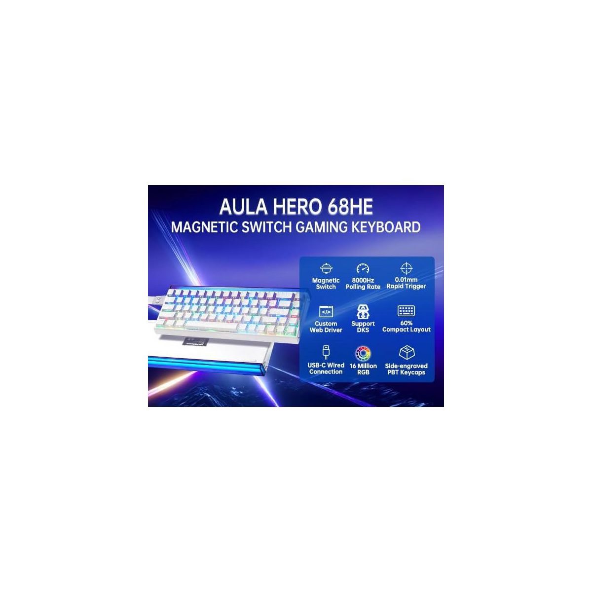 AULA Hero68 HE 60-Key Wired Hall Effect Gaming Keyboard, Magnetic Switch, RGB, Rapid Trigger and Response, Adjustable Actuation