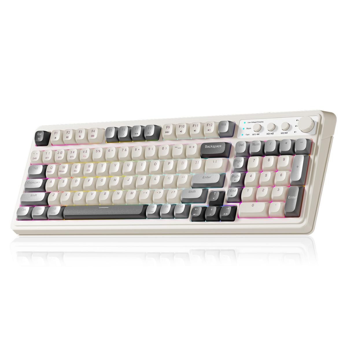 The AULA 99 Light-Up Keyboard combines retro charm with modern versatility, featuring Bluetooth 5.0, 2.4GHz wireless, and USB connectivity for seamless switching across five devices. With customizable RGB lighting, macro support, and a 96% layout including a numeric keypad, it’s built for both work and play. Ergonomic design and programmable keys ensure comfort and control, while compatibility with Windows, macOS, Android, and iOS makes it a reliable everyday companion.