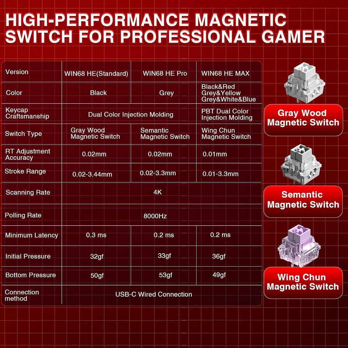 AULA WIN68 HE is a fast trigger magnetic gaming keyboard featuring an industry-leading 8000Hz polling rate and ultra-low 0.3ms latency—8x faster than traditional mechanical keyboards. Its Hall Effect switches offer adjustable actuation (0.02mm–3.44mm) with per-key precision, ideal for gamers and coders. Customize key functions, macros, and RGB lighting via a powerful web-based driver (Windows only, no download needed). With 16.8 million RGB colors, 14 lighting presets, and a compact 68-key layout, the WIN68 HE delivers speed, style, and space-saving performance.