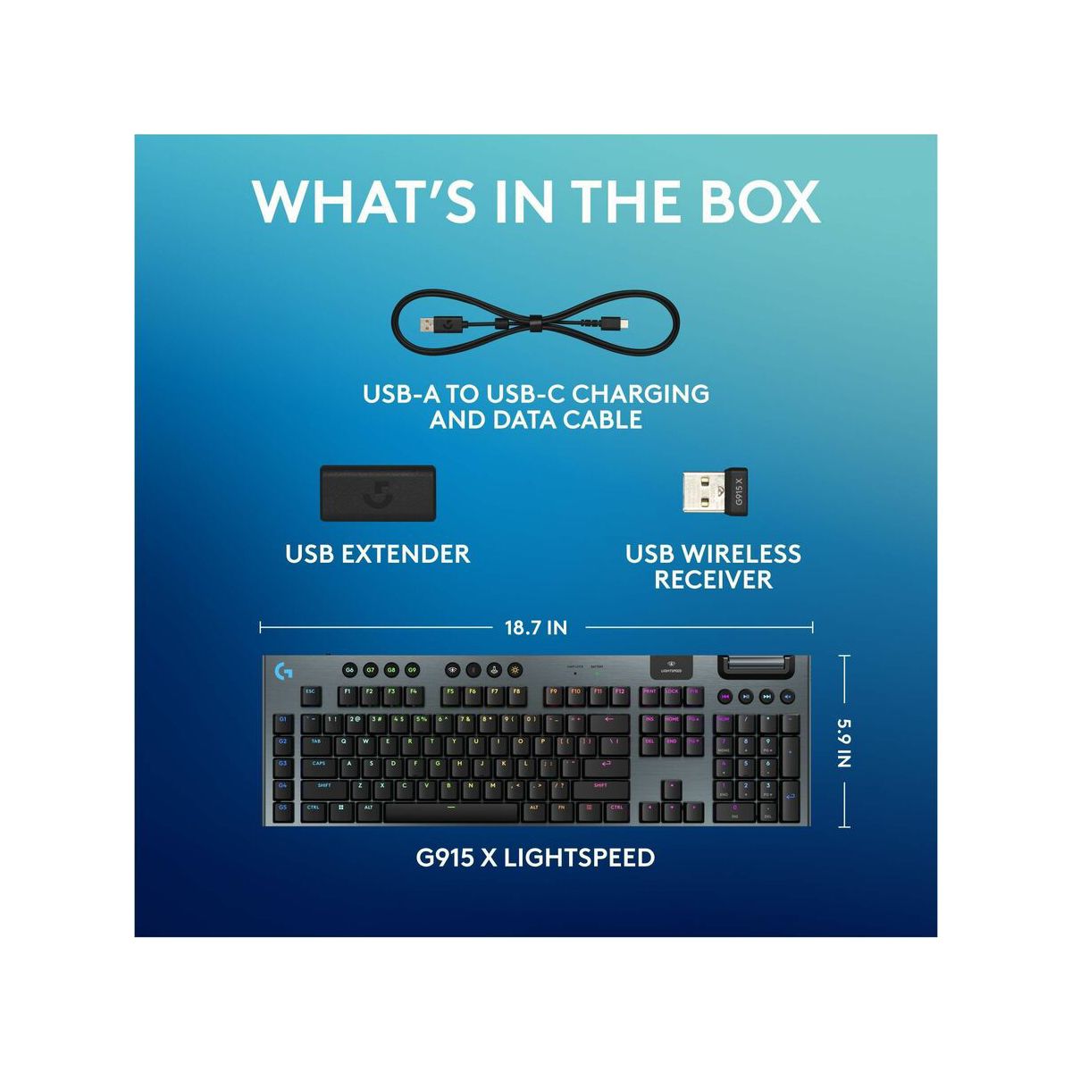 G915 X LIGHTSPEED low-profile wireless gaming keyboard offers the latest innovations in gaming technology with meticulously crafted design and curated materials.Experience more speed with tri-mode connectivity. Choose from best-in-class 2.4 GHz wireless, Bluetooth, and wired data mode. Play even faster with low-profile GL switches designed with 1.3 mm actuation rate.KEYCONTROL redefines industry innovation and allows you to set up to 15 functions per key. Soft touch media keys, 9 G-keys, and a cast iron volume roller provide quick access control.Premium materials complement design with double-shot PBT keycaps and finely-tuned machinery elevate the typing experience.Only 23 mm high, the G915 X LIGHTSPEED provides speed and durability with an impossibly slim aesthetic.Engineered for creative customization, LIGHTSYNC RGB offers access to ~16.8 M colors to customize and unify all of your Logitech G gear through G HUB.