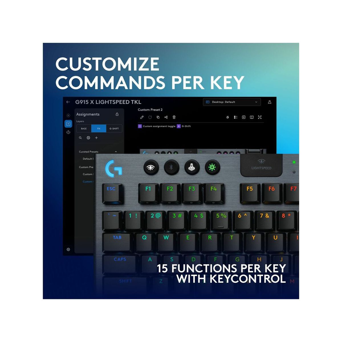 G915 X LIGHTSPEED TKL low-profile wireless gaming keyboard offers the latest innovations in gaming technology with meticulously crafted design and curated materials.Experience more speed with tri-mode connectivity. Choose from best-in-class 2.4 GHz LIGHTSPEED wireless, Bluetooth, and wired data mode. Play even faster with low-profile GL switches designed with 1.3 mm actuation rate.KEYCONTROL redefines industry innovation and allows you to set up to 15 functions per key. Soft touch media keys and cast iron volume roller provide quick access control.Premium materials complement design with double-shot PBT keycaps and premium machinery elevate the typing experience.Only 23 mm high, the G915 X LIGHTSPEED TKL provides speed and durability with an impossibly slim, tenkeyless aesthetic.Engineered for creative customization, LIGHTSYNC RGB offers access to ~16.8 M colors to customize and unify all of your Logitech G gear through G HUB.