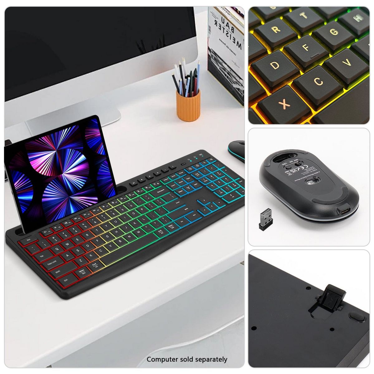 Upgrade your workspace with this Rechargeable Silent Wireless Keyboard and Mouse Combo, featuring a full-size 106-key layout and vibrant RGB backlighting. Designed for quiet operation and smooth performance, this set combines modern style with practical functionality for home, office, or gaming use. The included USB receiver and Type-C adapter enable quick 2.4G plug-and-play connectivity across devices, while the built-in rechargeable battery offers an eco-friendly, long-lasting power solution. With an ergonomic phone holder, ultra-thin profile, and an adjustable DPI mouse, this combo delivers comfort, precision, and everyday efficiency.