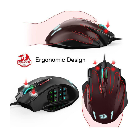 The Redragon M908 IMPACT MMO Gaming Mouse is a high-precision wired mouse designed for serious gamers, offering up to 12,400 DPI for pinpoint accuracy. It features 18 programmable buttons, including 12 conveniently placed side buttons, ideal for MMO games. With a weight tuning cartridge, five customizable user profiles, and 16.8 million LED color options, it delivers personalized performance and style.