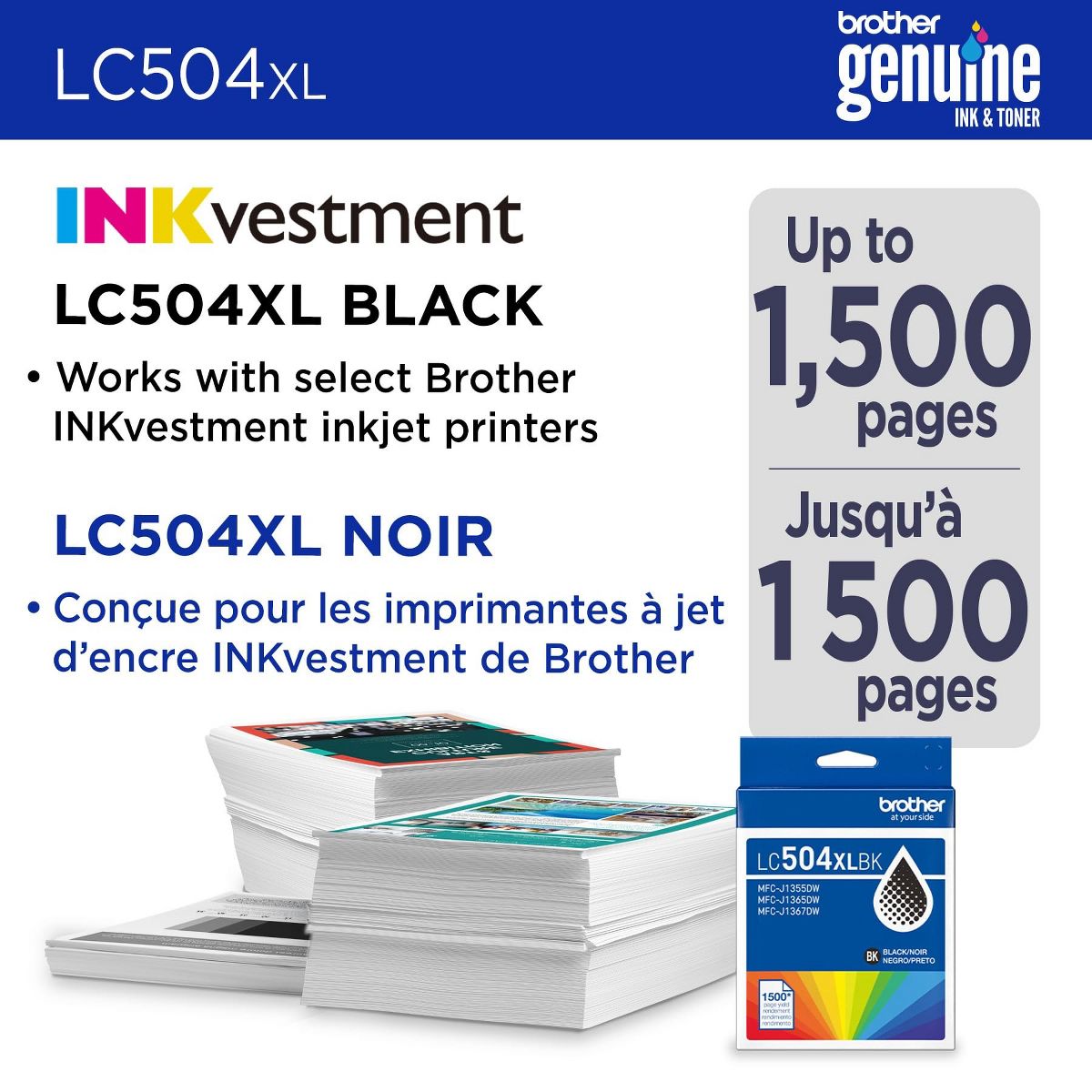 The Brother Genuine LC504XLBK High Yield Black Ink Cartridge is excellent for frequent printing needs. As a High Yield cartridge, it is rated to print up to 1,500 pages, which is fantastic for home offices or heavy document printing. The black ink is rich and dark, ensuring all documents, reports, and letters look professional and crisp. The product installs easily and works seamlessly with compatible Brother INKvestment printers without errors or compatibility issues. If you print black and white documents often, this cartridge is a reliable, high-volume choice.