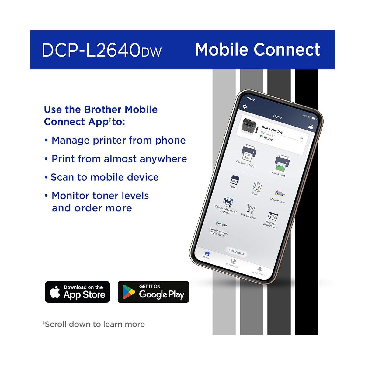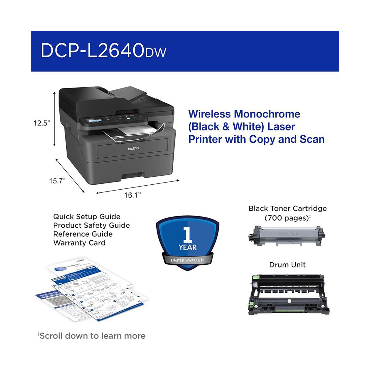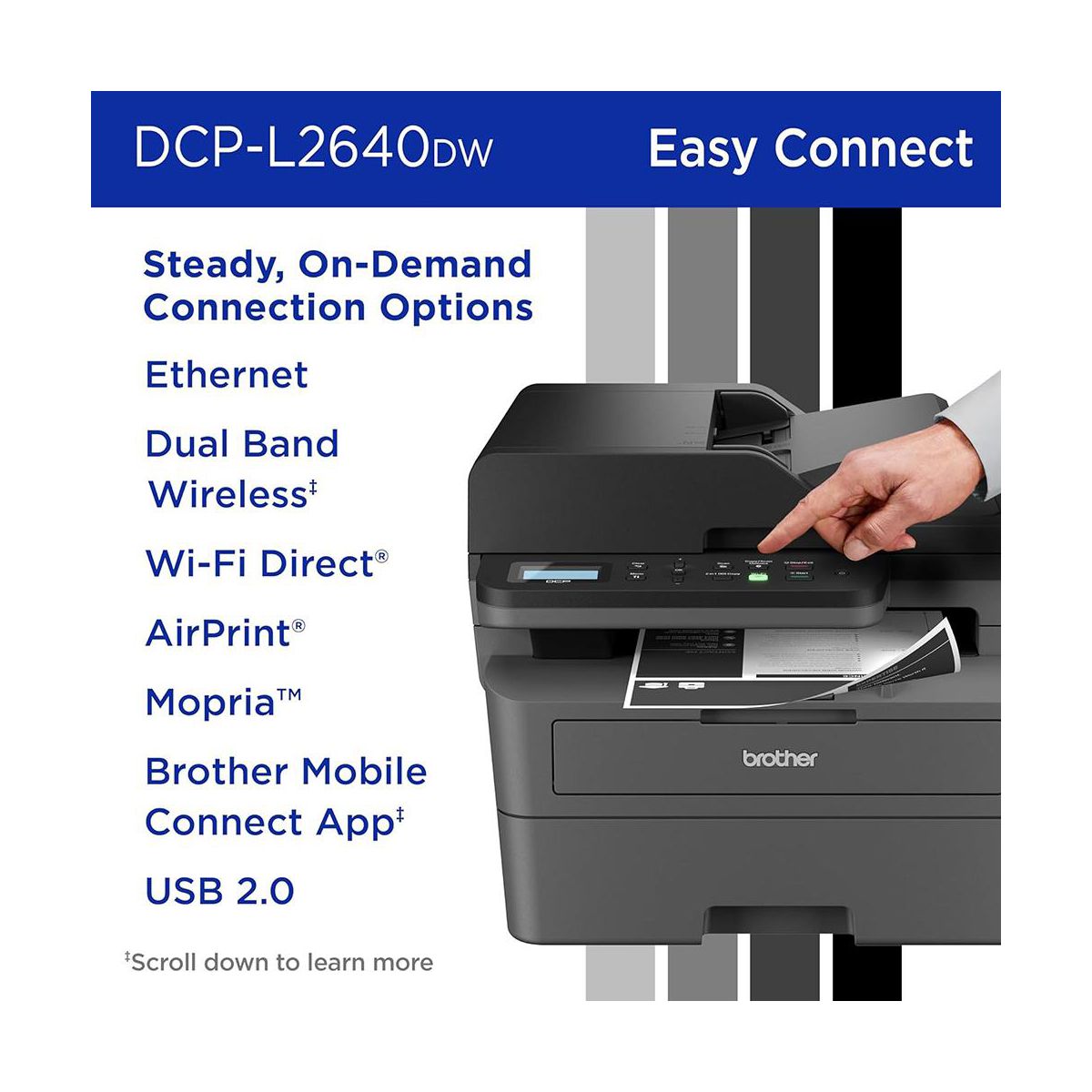 Wireless connectivity lets you print directly from your laptop, smartphone, or tablet, while the intuitive control panel makes operation simple for any user. Engineered for durability and low-cost performance, the DCP-L2640DW is the dependable solution for everyday documents, schoolwork, and business productivity.