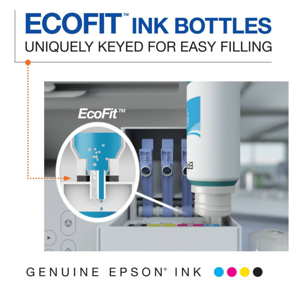 Epson’s EcoTank replacement ink bottles deliver thousands of pages, plus genuine Epson quality. Save up to 90 percent on ink with low-cost replacement ink bottles vs. ink cartridges. Plus, exclusive, uniquely keyed EcoFit bottles make it easy to fill each color tank.