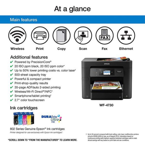 Make sure this fits by entering your model number. Get Performance Beyond Laser — the WorkForce Pro WF-4730, powered by PrecisionCore. Lightning fast color print speeds — fastest in its class (1); 20 ISO ppm (black) and 20 ISO ppm (color) (). Easy on the budget — up to 50 percent lower printing costs vs. color laser (2). Better quality than the lab. Worry-free handling. Convenient individual ink cartridges.